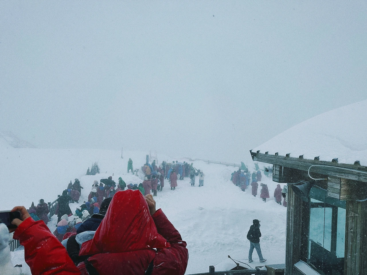 눈이 좀 잠잠해지긴 했지만 안개가 심해 케이블카를 타고 해발 4,506m 지점까지 올라가는 동안 설산의 능선은 아무것도 보이지 않았다. 보통 이때 케이블카를 타고 고도가 급격히 높아져서 고산병 증세가 오는 경우가 많다고 하는데, 다행히 우리는 아무렇지 않았다. 시야가 차단돼서 그런가?