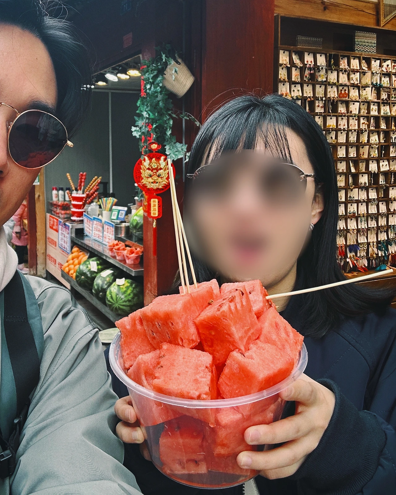 리장 과일이 맛있다는 이야기를 들어 걷다가 수박을 샀다. 가격은 15위안, 우리 돈 3천 원 정도였는데 양도 많았고, 맛도 아주 좋았다. 나중에 시장에 갔을 때 보니 이 가격도 관광지 내에서 파는 거라 비싼 가격이었을 정도로 가격이 저렴해 여행 기간 동안 과일을 자주 사 먹었다.