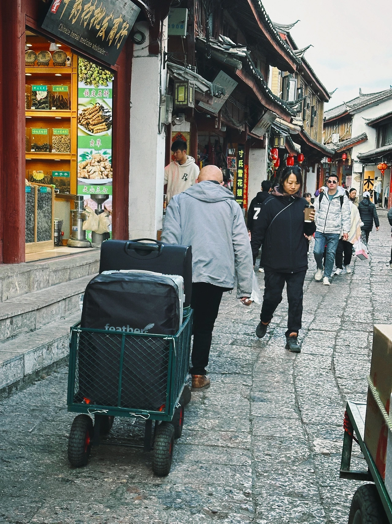 리장(丽江)에 도착한 날, 고성 안은 차량이 들어갈 수 없어 공항에서부터 타고 온 픽업 차량에서 내리니 고성 입구에 짐을 들어주러 장 씨 아저씨가 마중을 나와 계셨다. 고성은 울퉁불퉁한 돌바닥이라 케리어가 끌기 쉽지 않았는데, 다행히 커다란 카트를 가지고 오셔서 짐을 실어주셨다. 그를 따라 고성 안으로 들어서 처음 마주한 풍경은 어딘가 한옥마을을 닮았지만, 확실히 중국 특유의 결이 묻어 있었다.