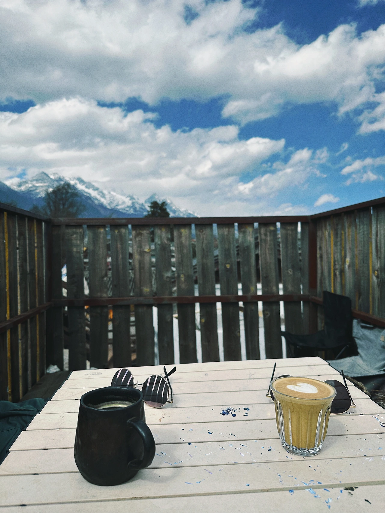 카페는 예술가들의 아지트 같은 조용한 분위기라 좋았고, 작지만 루프탑 공간도 있었다. 건물들이 붙어 있어 경치를 좀 가리긴 했지만 날씨가 좋아 멀리 옥룡설산의 하얀 능선이 구름 사이로 보였고, 그 아래에서 커피를 즐겼다.