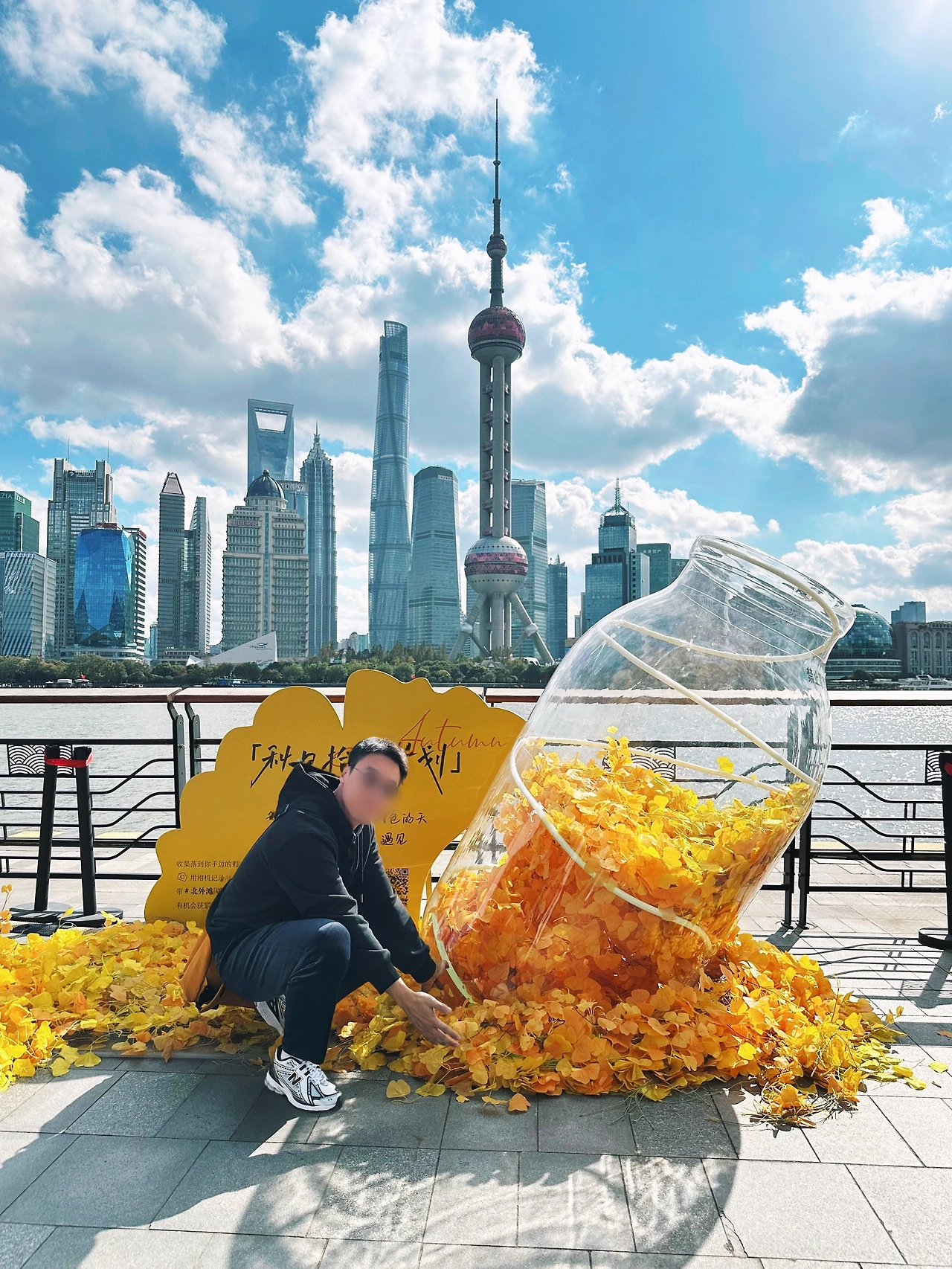 한참을 걷다 보니 햇살에 지친 몸이 슬그머니 쉬고 싶어졌다. 근처에 조용한 카페가 보여 자연스럽게 야외 테이블에 앉았고 동방명주가 바라보이는 풍경 속에서 커피를 천천히 마셨다. 노란 은행잎을 형상화한 조형물 아래로 햇살이 따뜻하게 내려앉았고 우리는 이런저런 이야기를 나누며 마지막 오후를 느긋하게 정리했다.