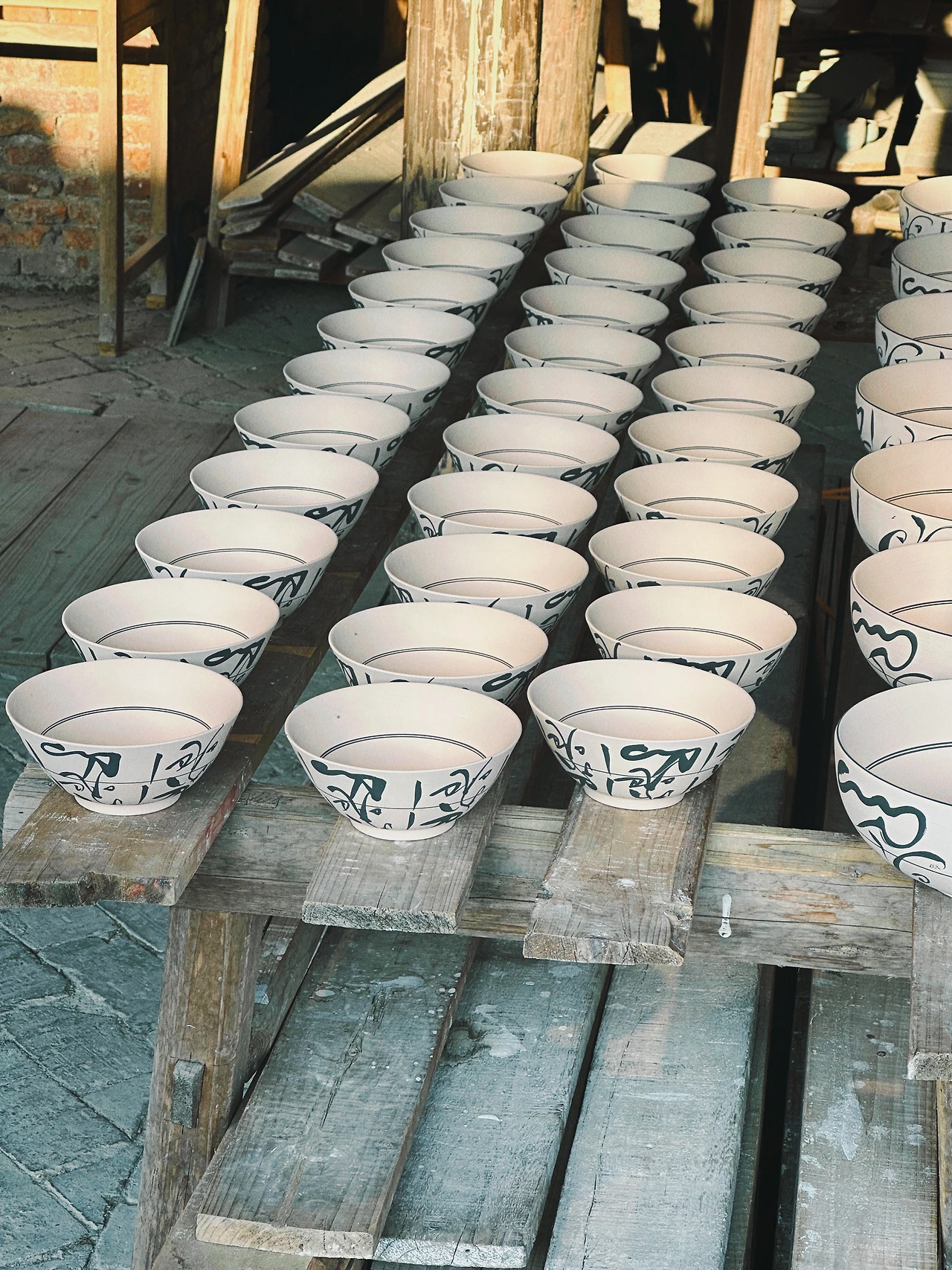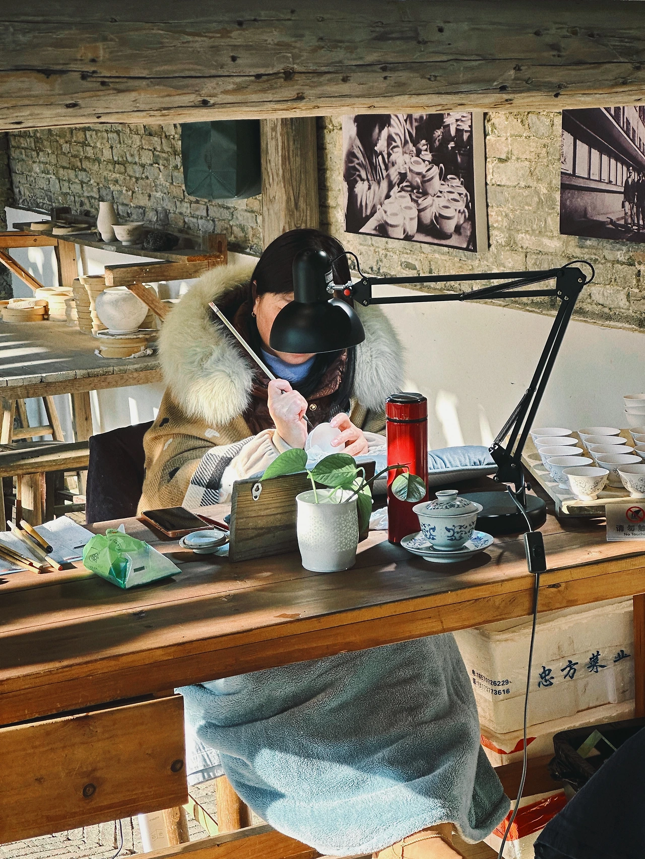 차로 이동하며 이야기를 나누다 자연스럽게 왜 중국에서 도자기를 공부하게 되었는지 물었고, 그 과정에서 알게 된 차이점 하나. 한국은 한 사람이 흙을 빚고 굽기까지 모든 과정을 아우르는 ‘도예(陶藝)’ 중심의 문화라면, 중국은 각 공정이 정밀하게 나뉘어 있고, 그중에서도 형태 위에 그림을 그리고 색을 입히는 ‘도자 공예(陶瓷工藝)’가 유독 발달해 있다는 것이었다.