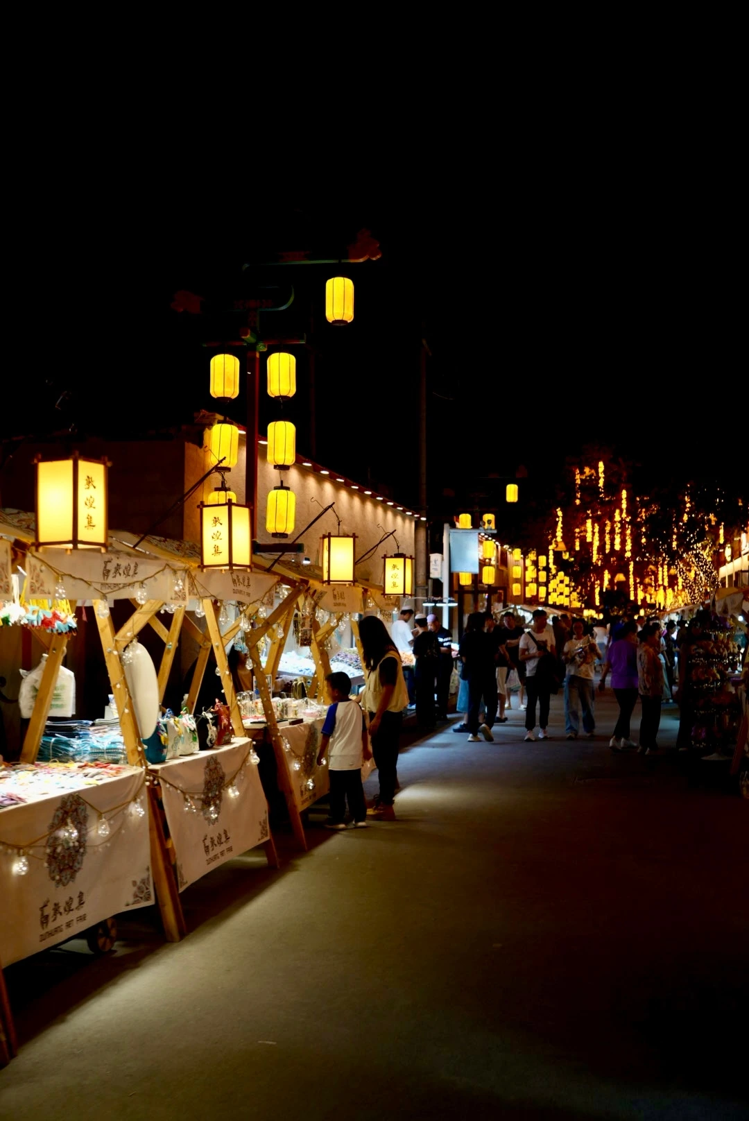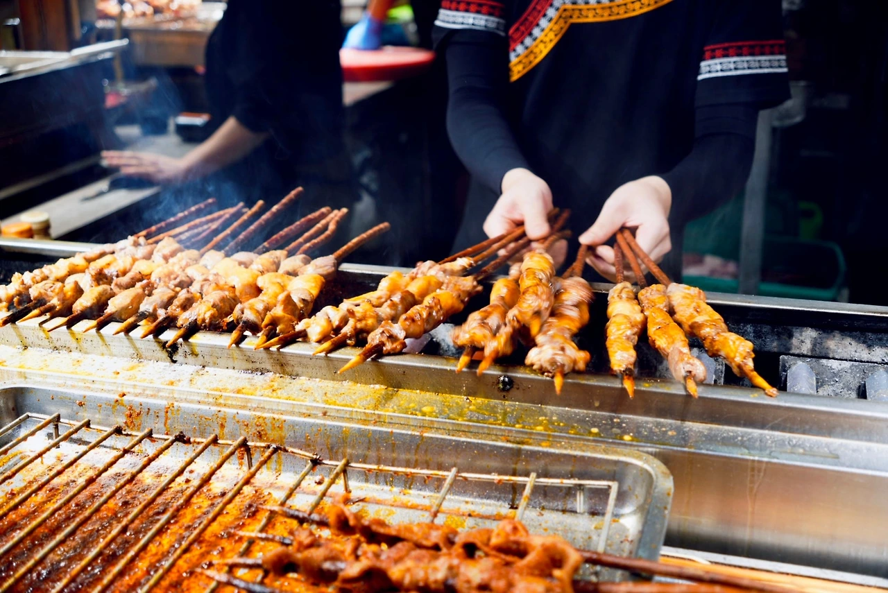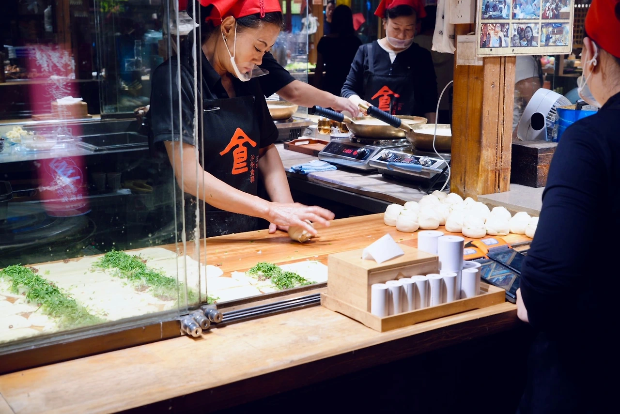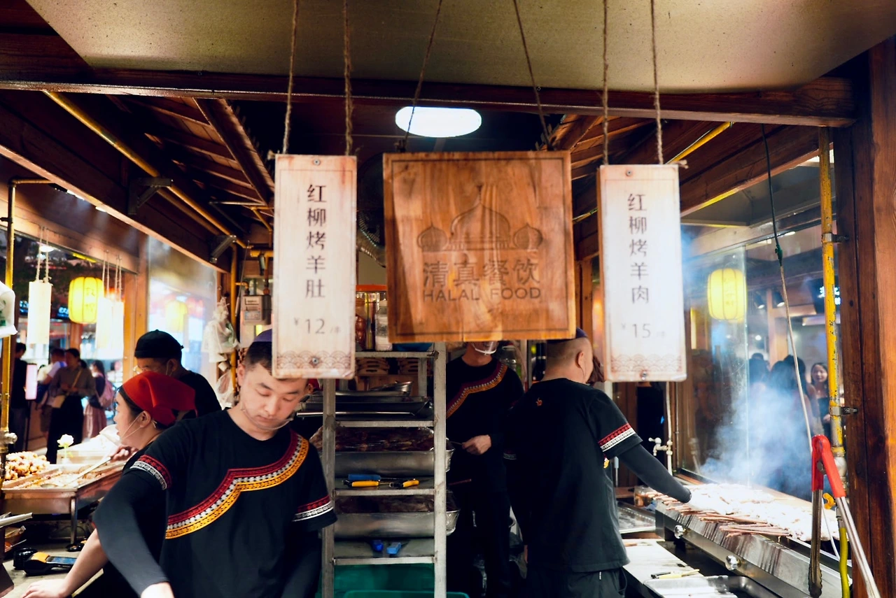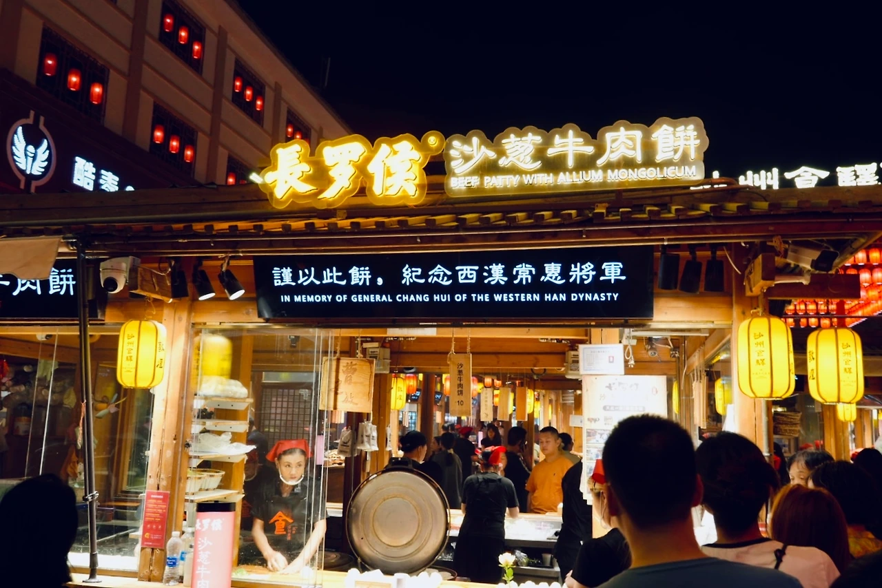 어둠이 내려앉을 즈음 도착한 야시장은 메인 구역과 상대적으로 한산한 구역으로 나뉘어 있었다. 메인 구역은 정돈된 분위기였고, 가게들은 밝고 깔끔하게 이어져 있었다. 사람들이 길게 줄을 서 있던 샤총뉴로우빙(沙葱牛肉饼, shā cōng niú ròu bǐng)은 군만두 같은 맛의 호떡 형태였고, 줄 서서 기다린 게 아깝지 않을 만큼 맛있었다. 양꼬치도 바로 구워 나와, 망설임 없이 손이 갔다.