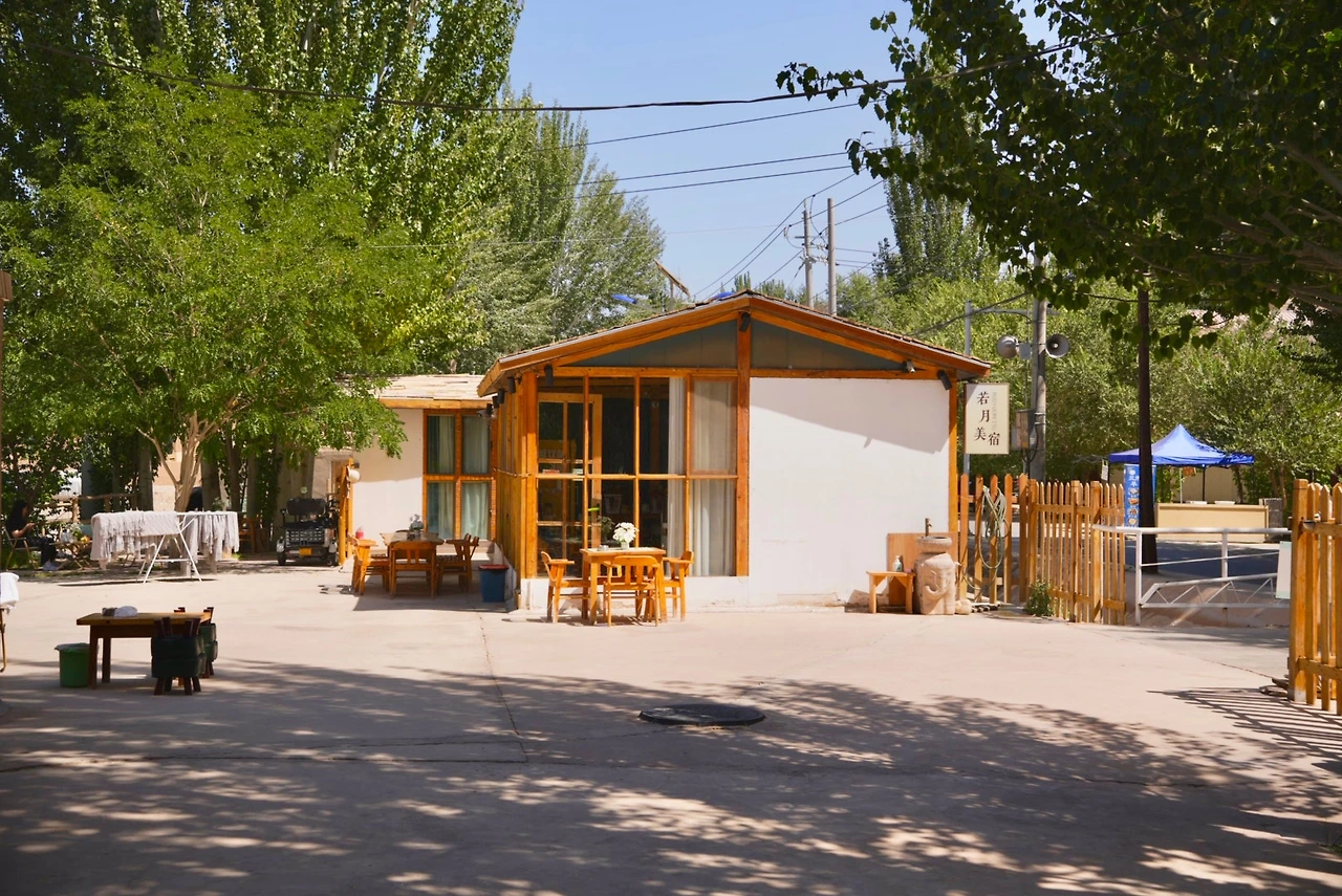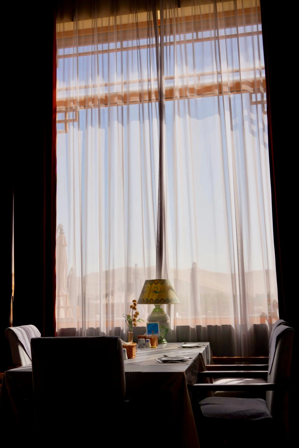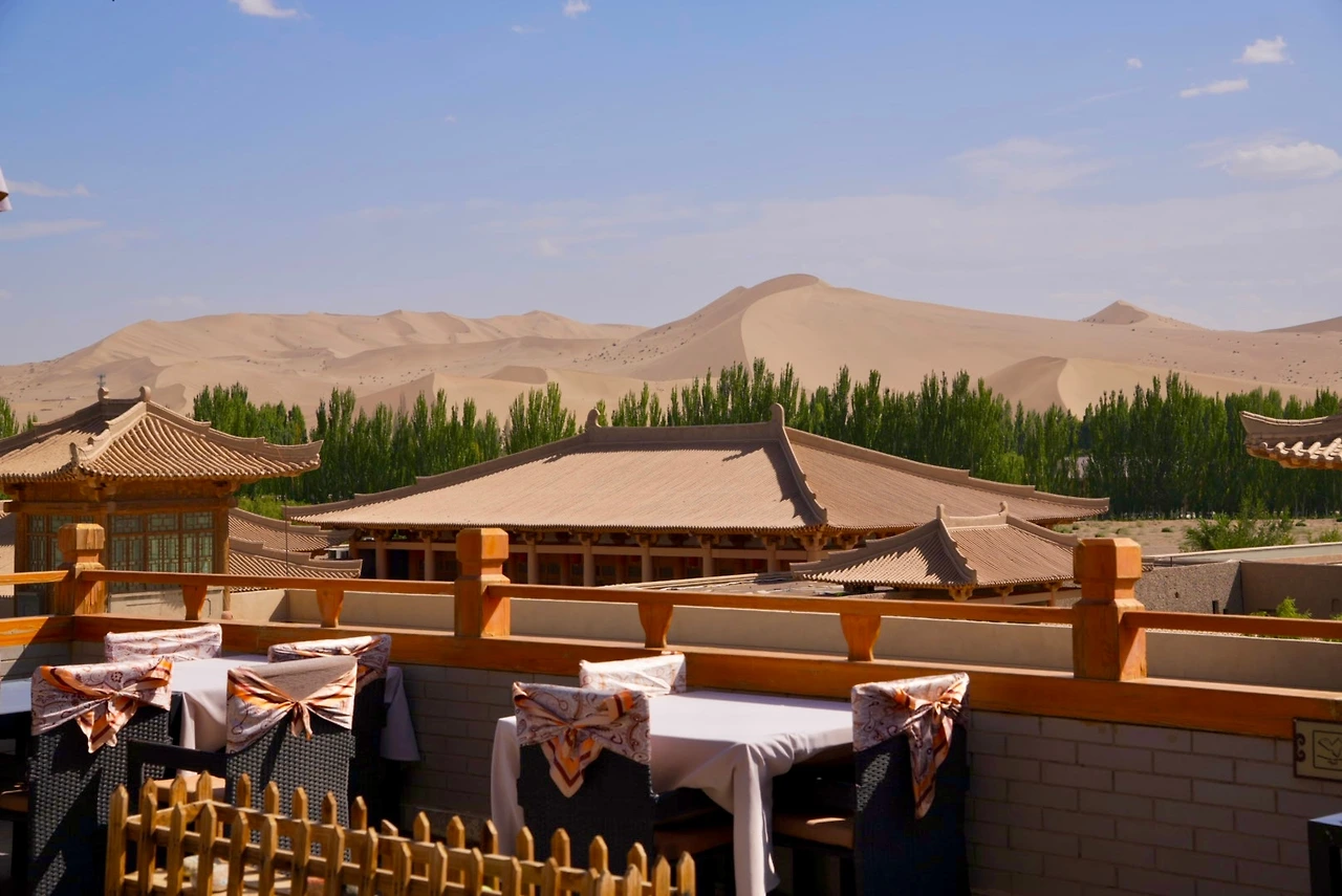 풍경은 너무 예뻤지만 사막의 햇살은 강했기에 샤오홍슈에서 미리 찾아 두었던 호텔 라운지로 향했다. 유주메이트(敦煌若月美宿, Dūnhuáng Ruòyuè Měisù) 라운지에서 바라본 사구 언덕은 사막에 와 있다는 사실을 가장 직관적으로 보여주고 있었다. 햇빛이 너무 강해 내려져 있던 얇은 커튼도 그 풍경에 자연스럽게 섞여 있었다.