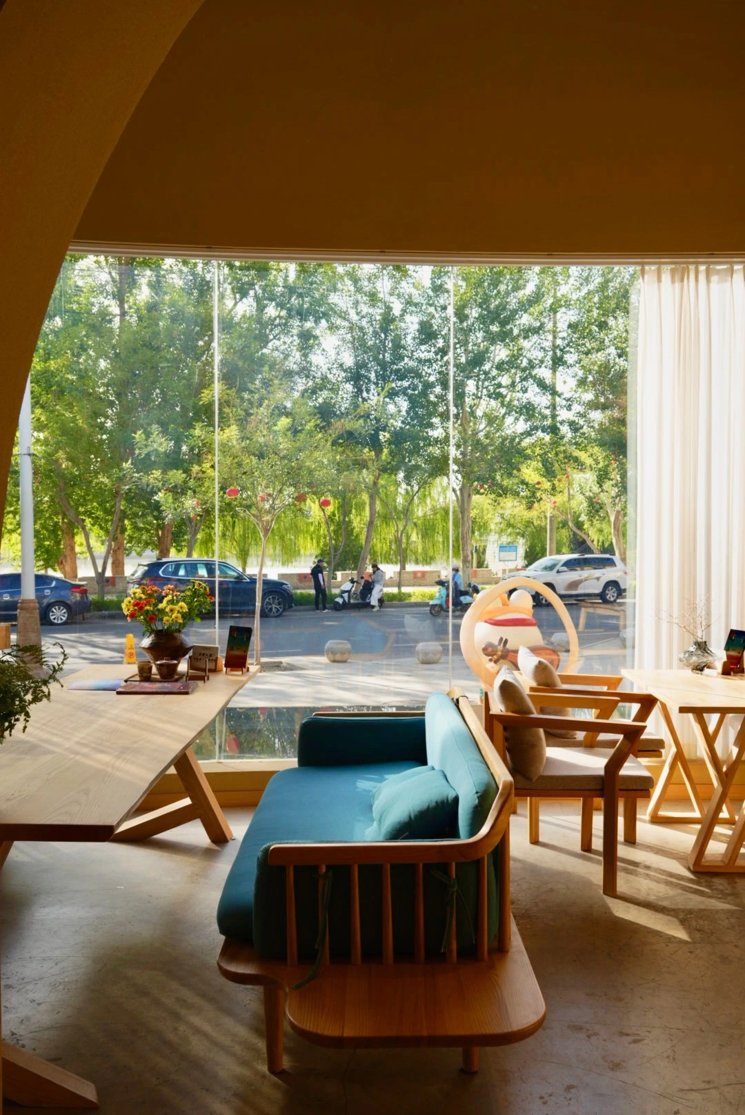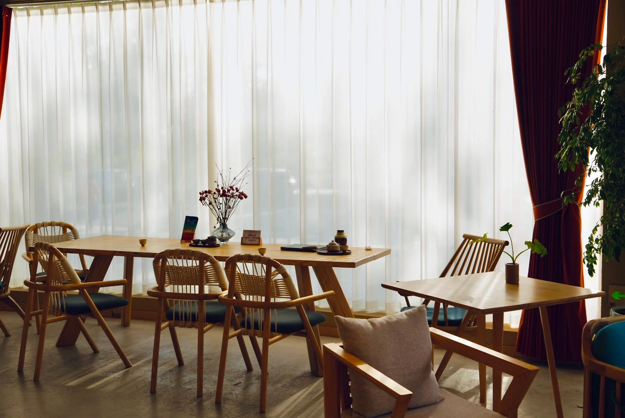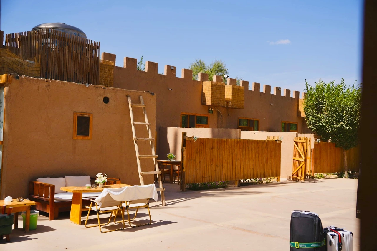 풍경은 너무 예뻤지만 사막의 햇살은 강했기에 샤오홍슈에서 미리 찾아 두었던 호텔 라운지로 향했다. 유주메이트(敦煌若月美宿, Dūnhuáng Ruòyuè Měisù) 라운지에서 바라본 사구 언덕은 사막에 와 있다는 사실을 가장 직관적으로 보여주고 있었다. 햇빛이 너무 강해 내려져 있던 얇은 커튼도 그 풍경에 자연스럽게 섞여 있었다.
