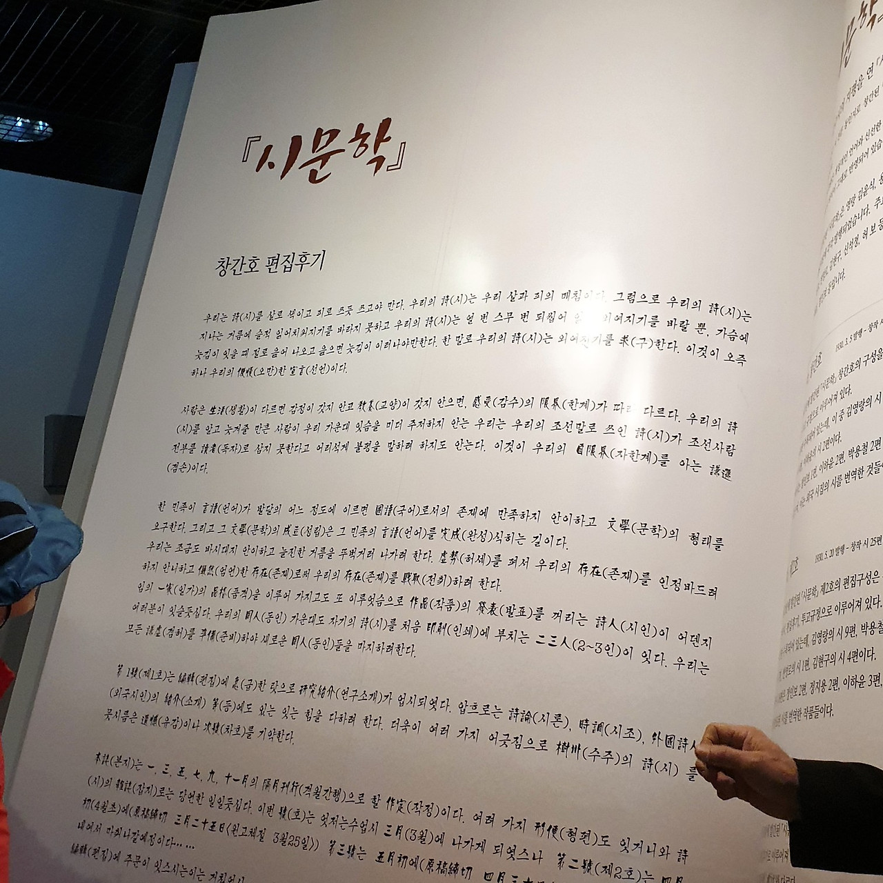 갈색 양복을 단정하게 차려입은 해설사 할아버지가 손짓을 하며 소리쳤다. 함께 기념관을 관람 중이던 수필 반 회원들이 옹기종기 모여들었다. 전시실 가장 안쪽에 천장에 닿을 정도로 커다란 책을 펼쳐 놓은 구조물이 눈에 들어왔다.