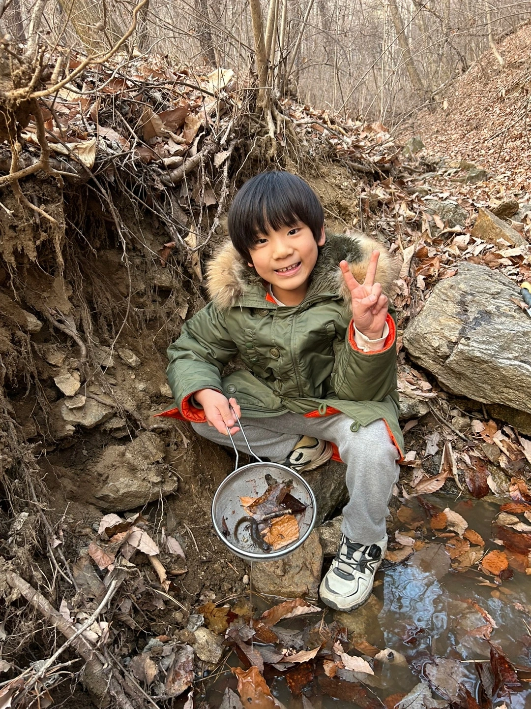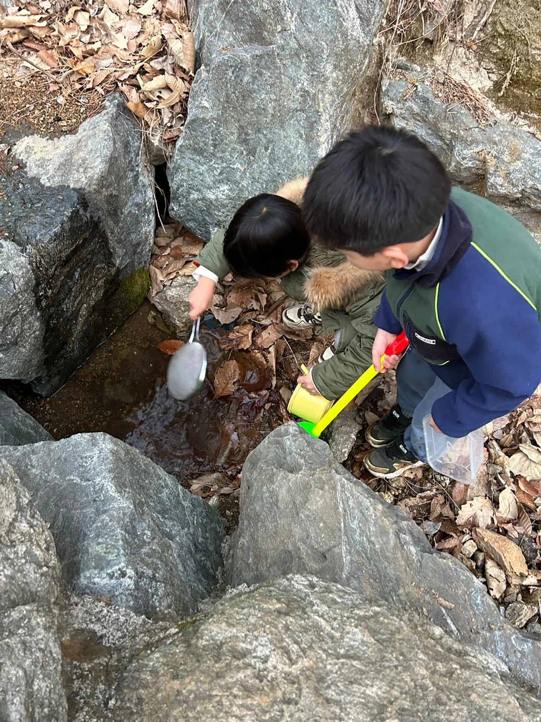 옆집에 두 살 어린 J는 1학년이라 더 일찍 하교해 벌써 작은 삽자루를 들고 냇가에 가 있다가 내 둘째를 보고는 "형아~~!"하고 더없이 반갑게 맞는다.