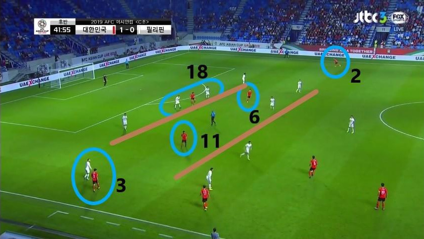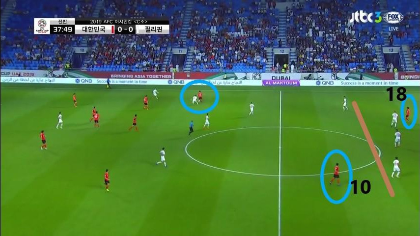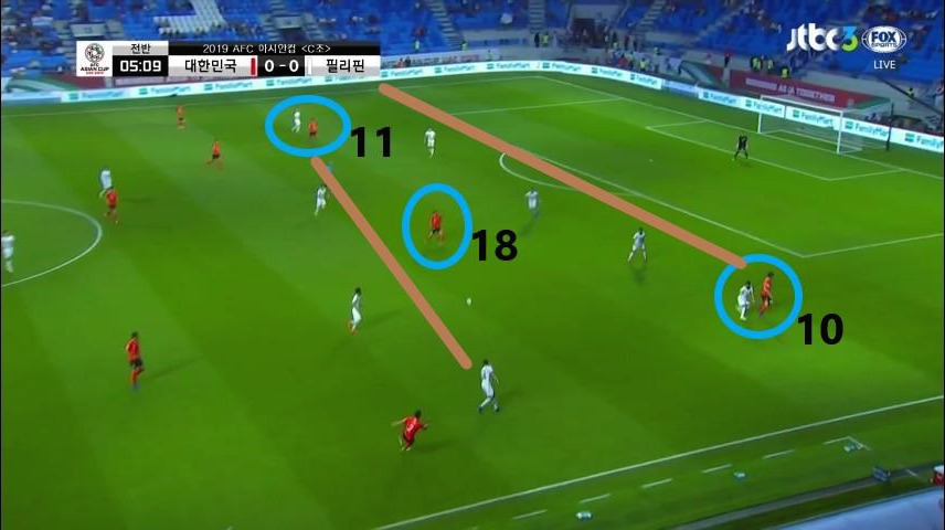 - '황희찬'(11번)과 '김진수'(3번)가 좌우 측면으로 넓게 벌려져 있기에 5백을 형성한 상대 수비도 넓은 형태를 취함(선수 간 간격이 벌어지는 상황.). 동시에 '황의조'(18번)과 '이재성'(10번)이 상대 최후방 수비수들과 함께 위치하며 DF와 MF 간의 간격을 넓힘. 이 공간을 '기성용'(16번)과 '구자철'(13번)이 활용하는 모습임.