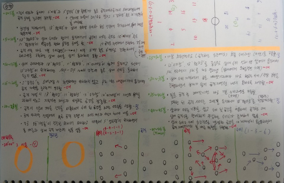 1. 패싱미스가 여러 차례 나오면서 볼을 오래 점유하고 있는 시간이 없었음. 볼을 소유한 선수와 볼을 받기 위한 선수 간의 의사소통이 원활하지 않은 모습이 보이면서 양 선수가 생각한 볼의 방향이 다르기에 패싱미스가 나온 것으로 보임. 특히, 최종 수비라인까지 센터라인 부근으로 올라온 상황에서의 볼 차단당함으로 인해 상대에게 여러 차례의 좋은 역습 기회를 내주었다는 점에서 보완이 필요함.