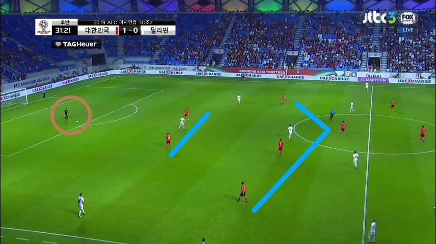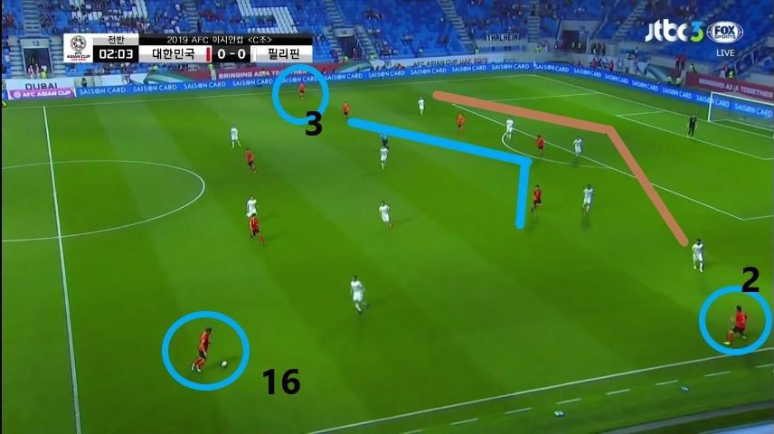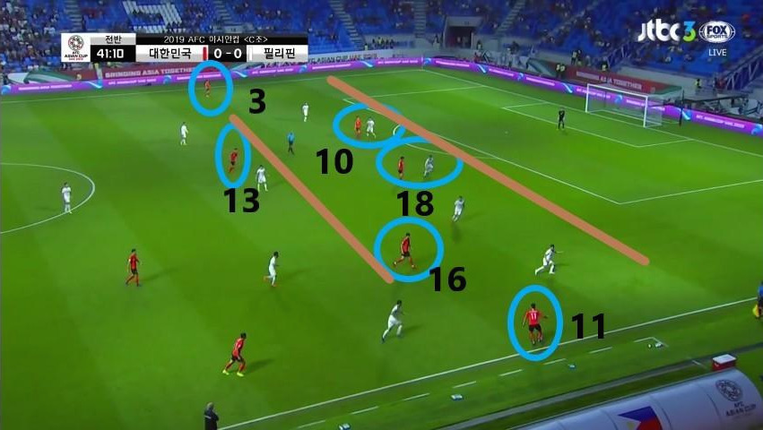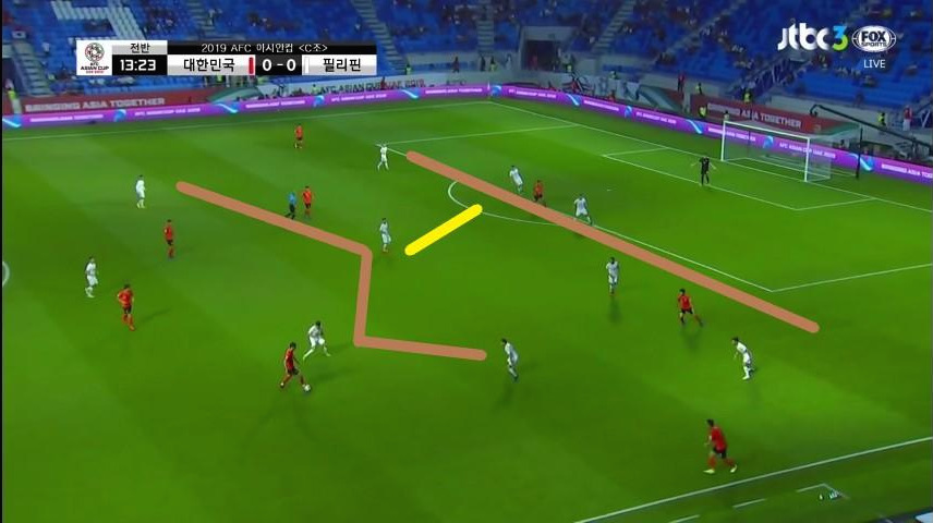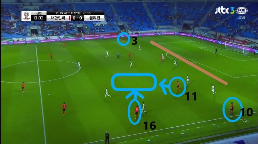- '김진수'(3번)와 '이재성'(10번)이 측면으로 넓게 벌어져 있기에 상대 최종 수비라인이 5백의 넓은 형태를 취함. 또한, 수비라인을 유도하면서 발생한 DF와 MF 사이의 공간을 '황희찬'(11번)과 '기성용'(16번)이 활용하기 위해 이동함.