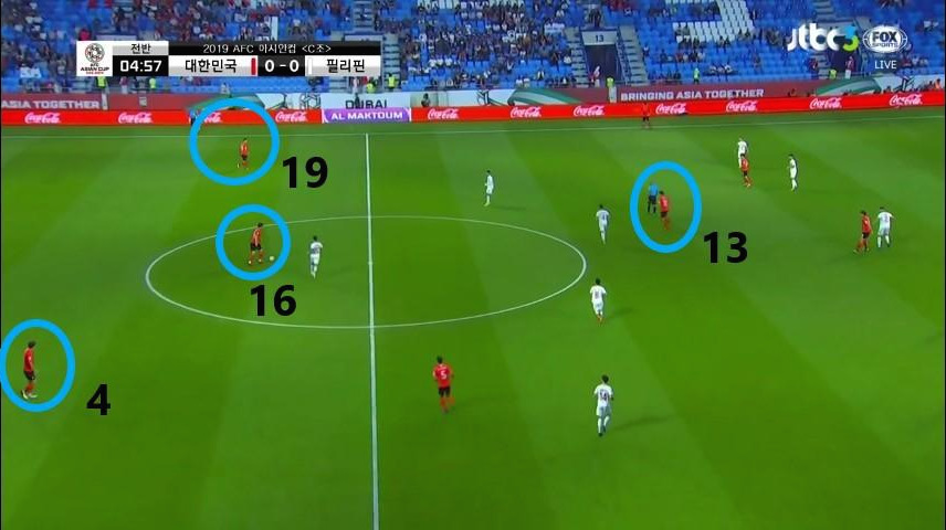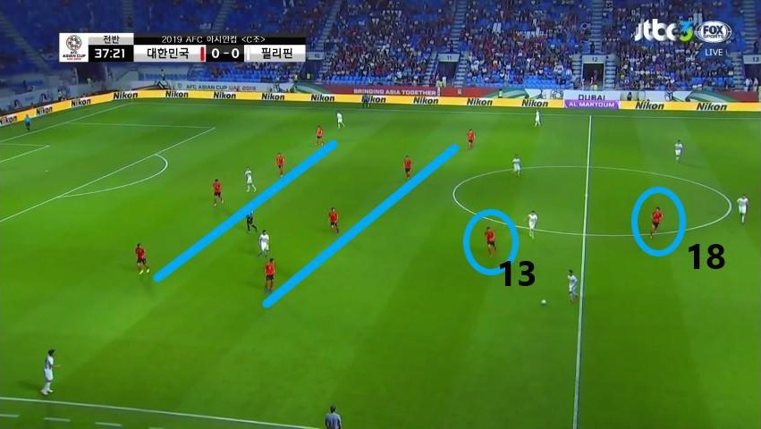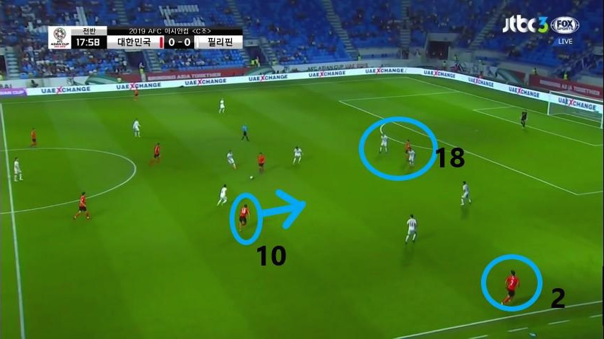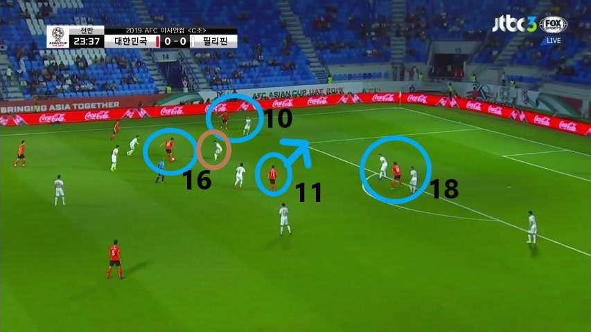 - 최전방 공격수 '황의조'(10번)은 상대 최후방 수비수들의 집중 견제 대상이었으며 '이재성'(10번)은 측면에서 상대 수비수와 함께 움직임. 동시에, '기성용'(16번)이 볼을 소유하면서 상대 수비수가 맨투맨마킹을 시도함. 수비 배후 공간을 '황희찬'(11번)이 침투할 준비를 함.