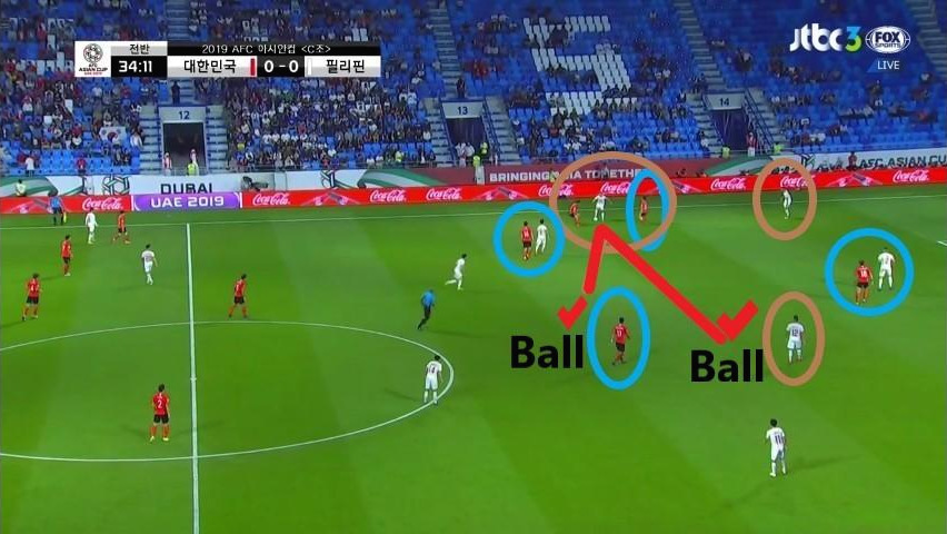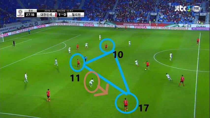 - '황인범'(6번) 투입 이후 미드필더 지역에서의 세밀한 움직임을 보임. '구자철'(13번), '황희찬'(11번)', '황인범'(6번)이 각각 상대 수비에게 대인(Man-to-man)마킹을 당하고 있으나, 삼각형 형태를 취하며 패싱(Passing)으로 공간을 창출하고 볼을 전방으로 배급하려는 의도를 보임.