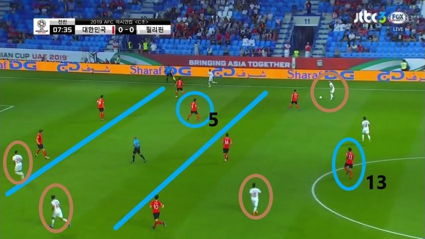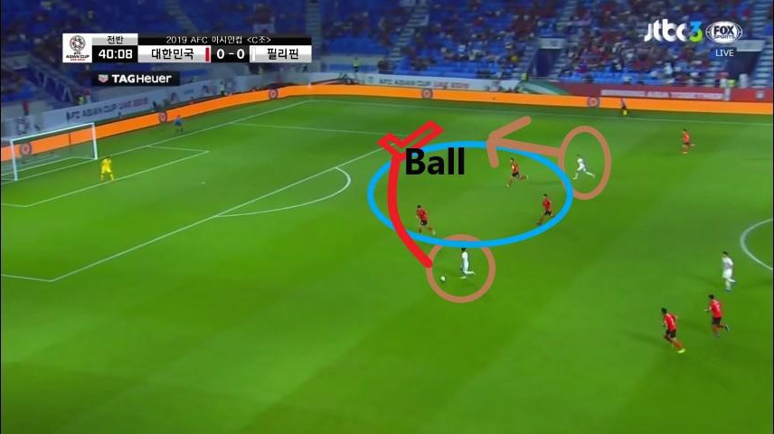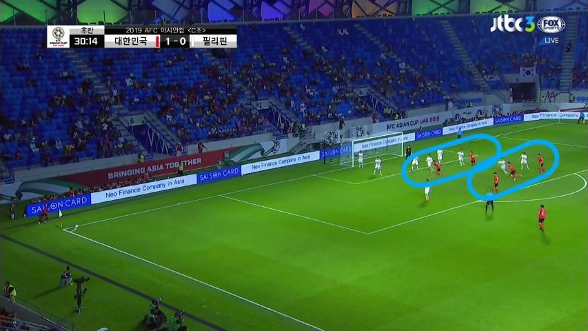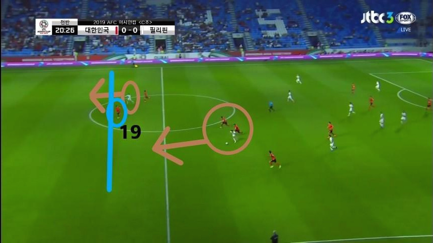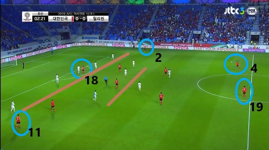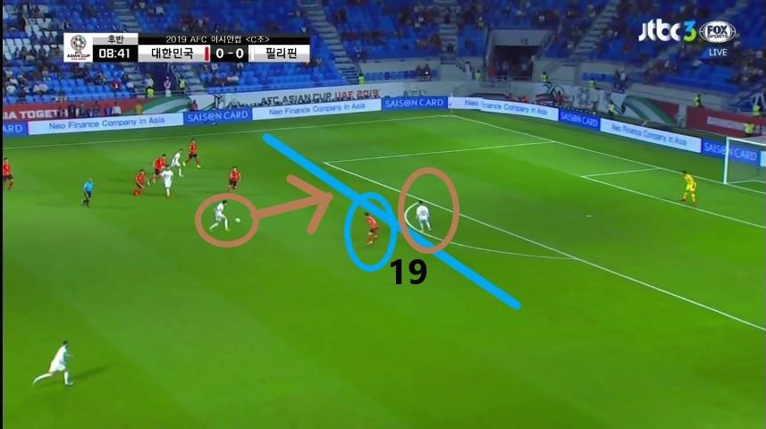 - 수비지역에서 대기 하는 선수는 '김영권'(19번)이 유일함. 이때에도, 상대의 최전방 공격수는 오프사이드(Off-side)라인에 위치하지만 수비 시 공격수의 움직임을 놓치면 위험한 상황에 직면할 수 있기에 '김영권'이 마킹해야 할 선수는 2명(볼을 잡은 선수와 최전방 공격수)이라고 볼 수 있음. 두 선수가 약속된 움직임으로 최종 수비를 속인다면, 충분히 득점할 수 있는 위험한 상황임.