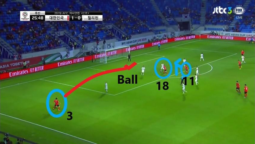 - '김진수'(3번)가 좌측면에서 골문 앞으로 크로싱(Crossing)할 시 상대 수비수의 집중 견제를 받고있는 '황의조'(18번)는 수비수와 함께 골문으로 이동함. 선수의 이동으로 생긴 빈공간을 '황희찬'(11번)이 침투하면서 헤더(Header) 기회를 노리는 움직임을 보임.