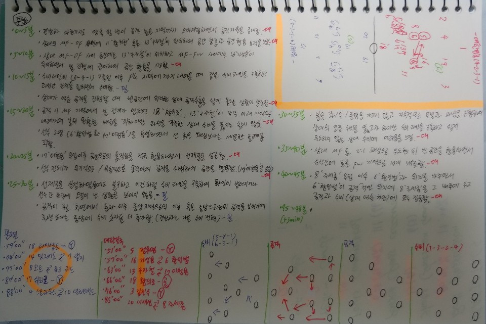 - 수비지역부터 볼을 배급하여 미드필더 지역을 거쳐 측면의 활용한 뒤 공격지역으로 연결되어 마지막 슈팅(Shooting)이 골문을 가르는 상황임. 비어있는 공간에 위치한 선수들과 볼이 이동하는 순간 마다 지속적으로 움직이는 선수들이 만들어낸 합작품임. 마지막 '황희찬'(11번)의 돌파와 '황의조(18번)'의 마무리가 돋보임.