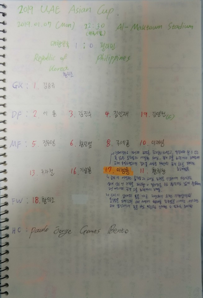 2019년 01월 07일 월요일 22:30(한국시간) 아랍에미레이트(UAE) 두바이(Dubai)의 알 막툼 스타디움(Al-Maktoum Stadium)에서 2019 AFC 아시안컵 C조 1차전 대한민국과 필리핀의 경기가 열렸다.
