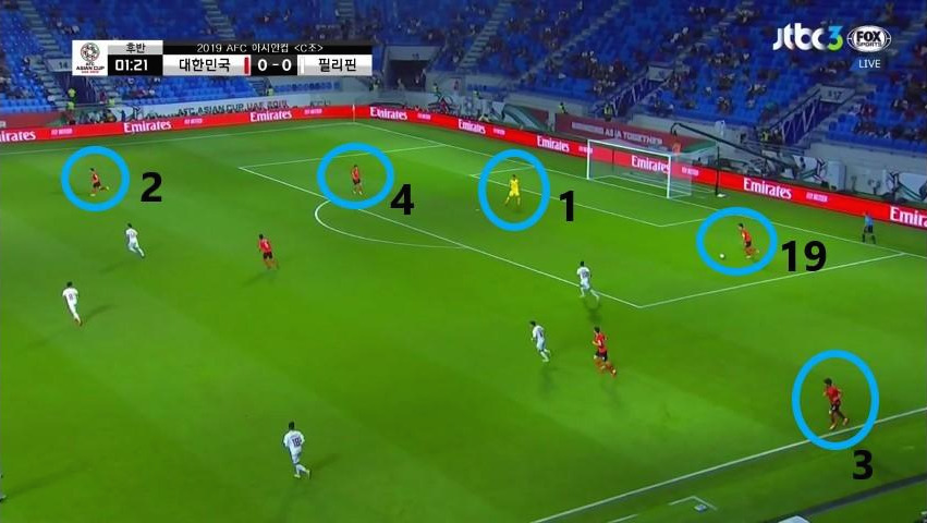 - 골키퍼(GK) '김승규'(1번)를 이용한 패싱(Passing) 플레이를 전개할 때 중앙 수비수 '김영권'(19번)과 '김민재'(4번)이 간격을 넓히고, 양 측면 윙백(Wing back) '김진수'(3번)와 '이용'(2번)은 공격지역으로의 전진 형태를 보임.