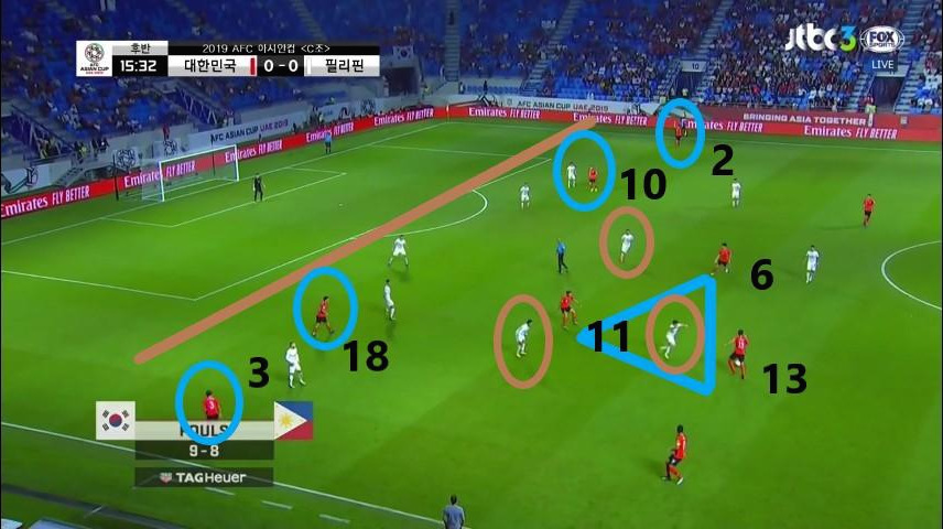 대한민국은 이날 필리핀의 전원 수비 전술로 인해 공격 지역에서 전후반 모두 상대의 빈틈을 찾지 못하였으며, 오히려 필리핀의 빠른 역습에 여러 번 위기를 맞이하기도 하였다. 이번 경기의 키워드는 '상대 수비 유도', '유기적인 움직임' 그리고 '최종 수비라인'이 세 가지라고 생각한다.
