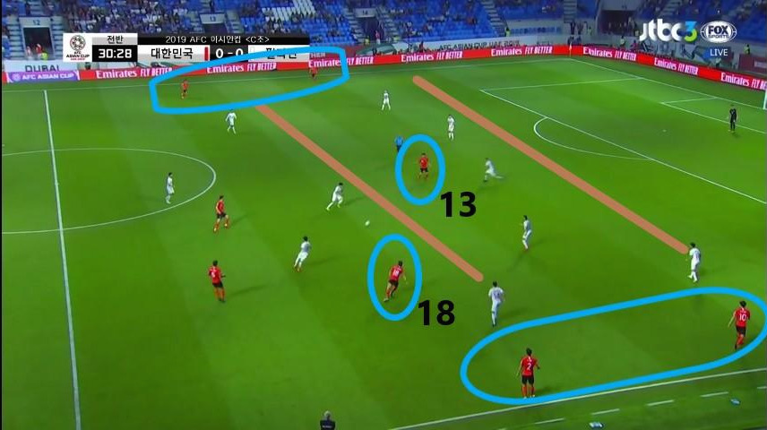 - 후반에도 전반과 동일한 공격 형태를 보임. 중앙 수비수 '김영권'(19번)과 '김민재'(4번)이 센터서클(Center circle) 부근으로 올라오며 라인을 높임. 동시에 '황의조'(18번)는 상대 중앙 수비수와 동일 선상에 위치하며 대인마킹을 당함. '이용'(2번)과 '황희찬'(11번)은 양 측면을 적극적으로 활용하며 상대 수비를 분산시킴.