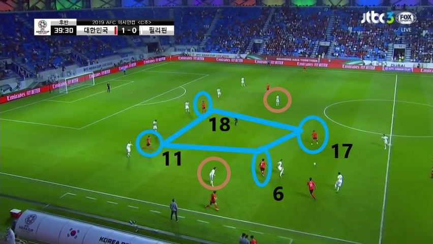 - '이청용'(17번)과 '황인범'(6번)을 활용한 2선의 세밀한 무빙(Moving)과 패싱(Passing)으로 상대 MF지역의 빈 공간을 유도함. '황의조'(18번), '황희찬'(11번)과 함께 이룬 사각형의 공간이 활용하기에 충분함을 알 수 있음.