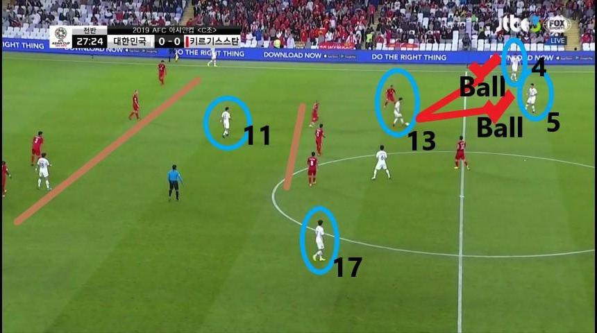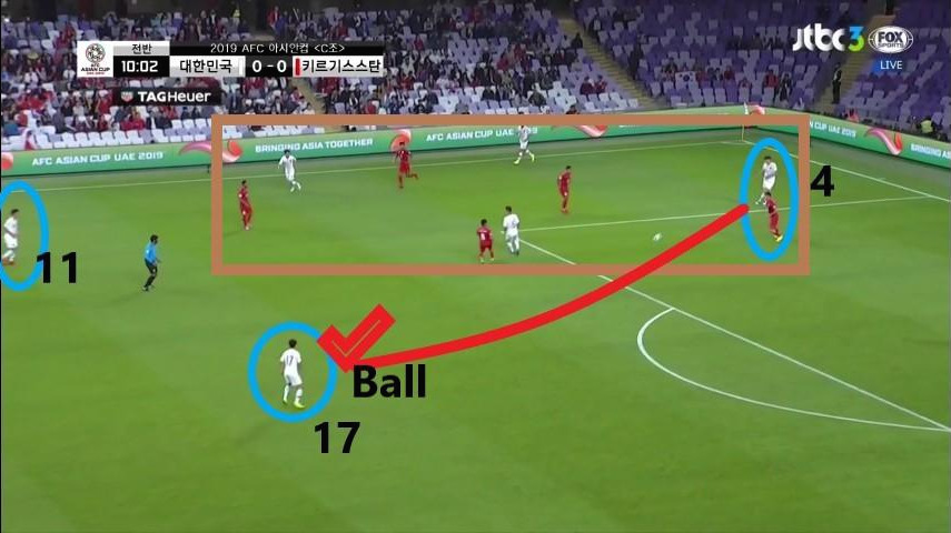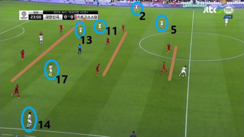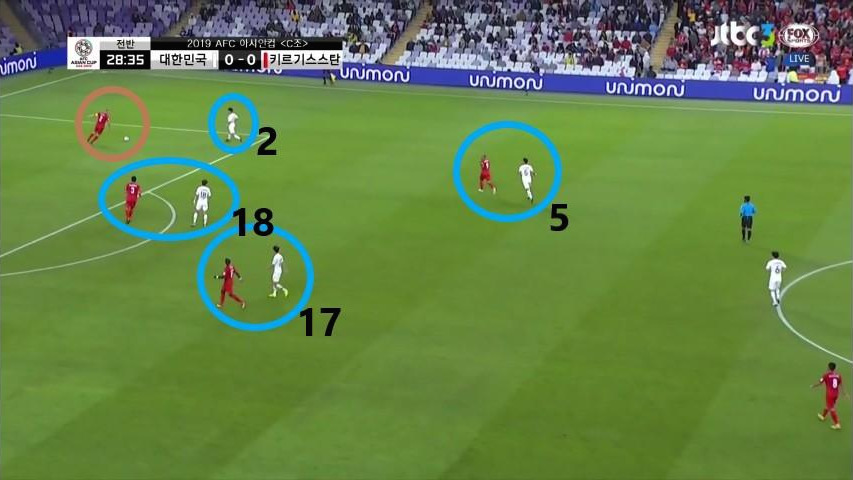- 볼이 수비 진영에 있을 시 상대의 전방압박 모습임. 상대 공격자원 5명이 볼이 위치한 좁은 공간에만 밀집되어 있으며 강하게 압박하지 않기에 '김민재'(4번)가 볼을 전방으로 배급하는데 수월함. 비어있는 공간에는 '이청용'(17번)과 '황희찬'(11번)이 있으며, 상대의 공격자원과 수비자원 간의 간격이 넓기에 쉽게 전진이 가능함.