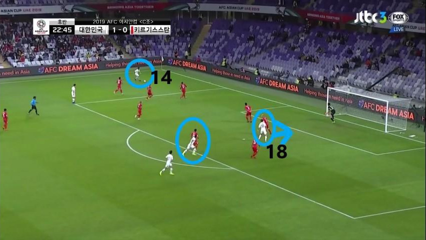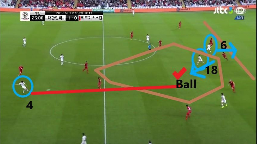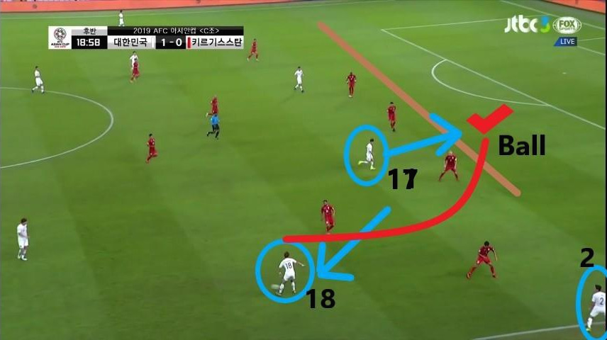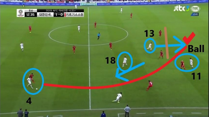 - 위의 사진과 마찬가지로 이번에도 상대 수비의 뒷공간을 활용하는 장면임. 이번에는 '김민재'(4번)가 비어있는 공간으로 파고드는 움직임을 보이는 '황희찬'(11번)에게 볼을 전달함. '황희찬'이 이러한 움직임을 취할 때 최전방 공격수(ST) '황의조'(18번) 또한 상대 수비와 함께 움직이며 상대 수비가 쉽게 다른 선수에게 다가가지 못하도록 유인함.