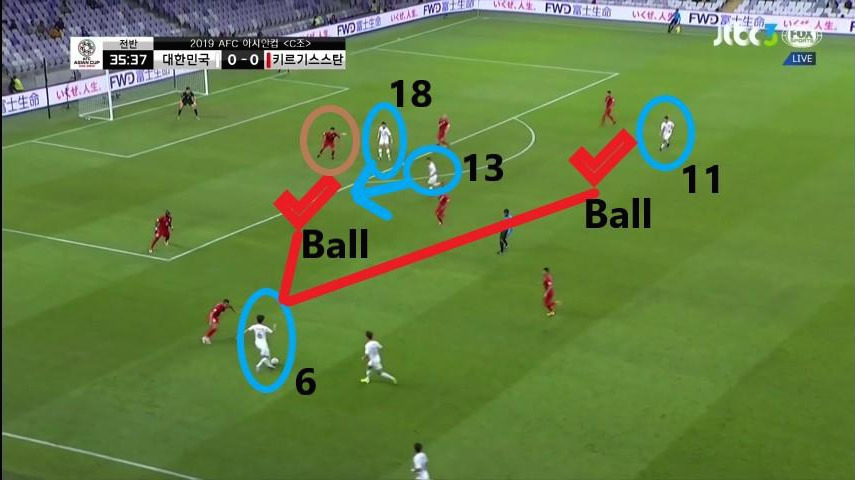 - 공격(FW)와 미드필더(MF) 사이 2선 위치에서의 공격 작업 모습임. '황의조'(18번)이 상대 수비의 발을 묶어놓은 상태에서 '구자철'(13번)과 '황희찬'(11번)이 전방과 후방에서 비어있는 공간으로 움직이며 볼 배급로를 형성함. '황인범'(6번)은 패싱루트(Passing Route)가 최소 2방향으로 발생하였기에 공격 작업을 이어나가는데 수월함.