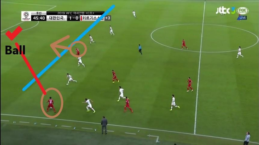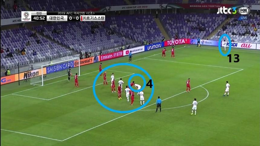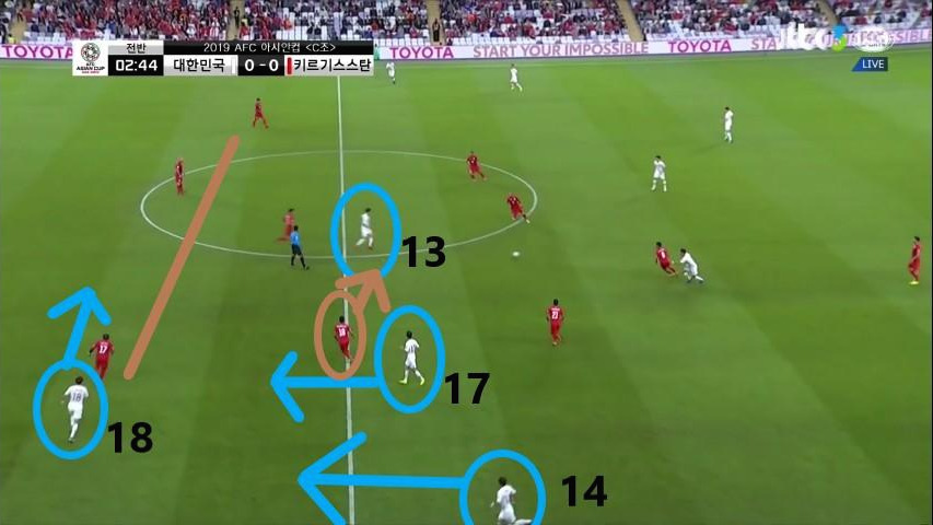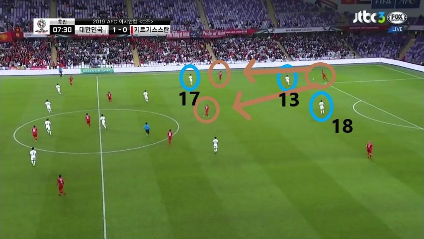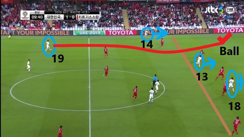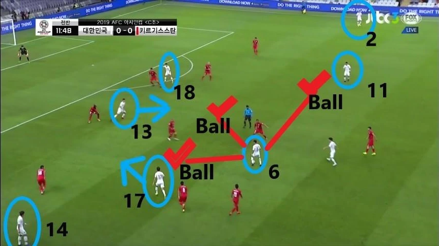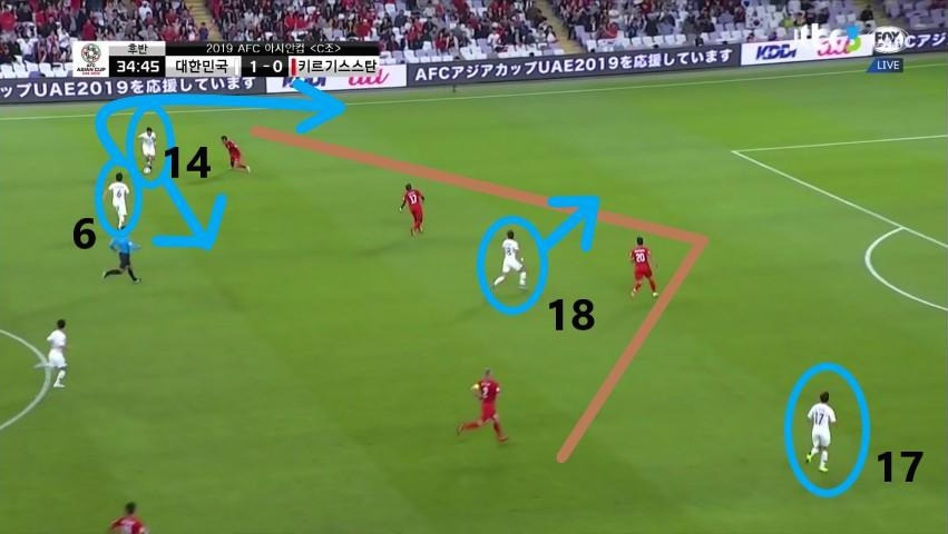 - '황의조'(18번)의 움직임이 돋보이는 장면임. '황의조'가 미드필더 지역으로 이동하면서 맨투맨(Man-to-man)마킹 하던 상대 수비수까지 함께 이동함. 이때, '구자철'(13번)이 전진하면서 '김민재'(4번)가 볼을 비어있는 공간에 배급하는데 수월하도록 함. 선수 간 위치 스위칭(Switching)을 통해 상대 수비에게 혼란을 야기하는 움직임을 보임.