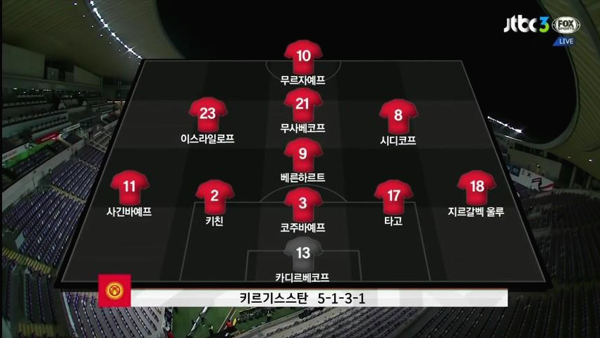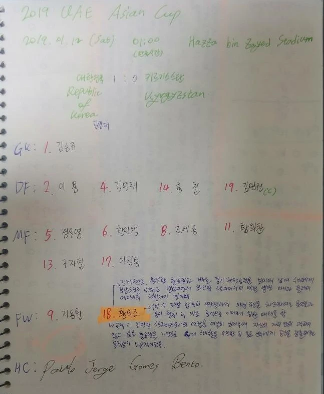 2019년 01월 12일 토요일 01:00(한국시간) 아랍에미레이트(UAE) 알아인(Al-Ain)의 하자 빈 자예드 스타디움(Hazza bin Zayed Stadium)에서 2019 AFC 아시안컵 C조 2차전 대한민국과 키르기스스탄의 경기가 열렸다.