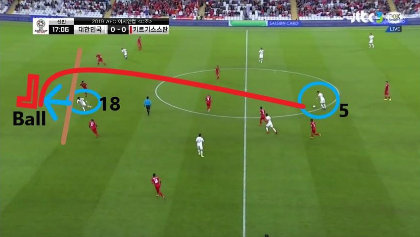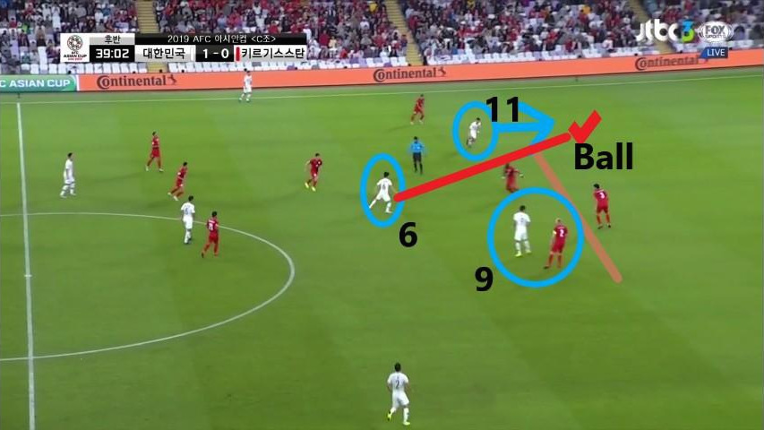 - '황인범'(6번)이 상대 수비의 뒷공간으로 움직이는 '황희찬'(11번)에게 직선 패싱(Passing)으로 볼을 넣어주며 기회를 창출하는 모습임. 이때, 교체 투입된 '지동원'(9번)이 상대 중앙수비수들의 발을 묶었기에 '황희찬'의 움직임을 차단하기 위한 수비자원은 없었음.