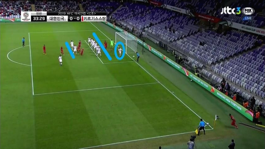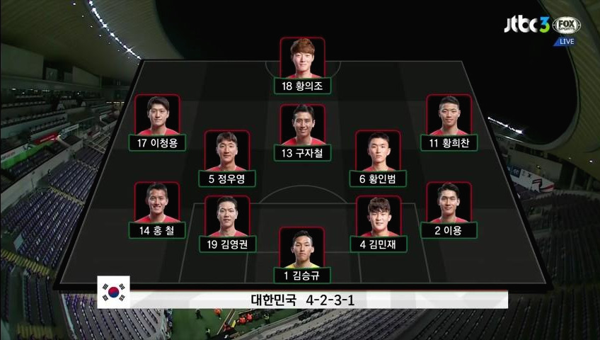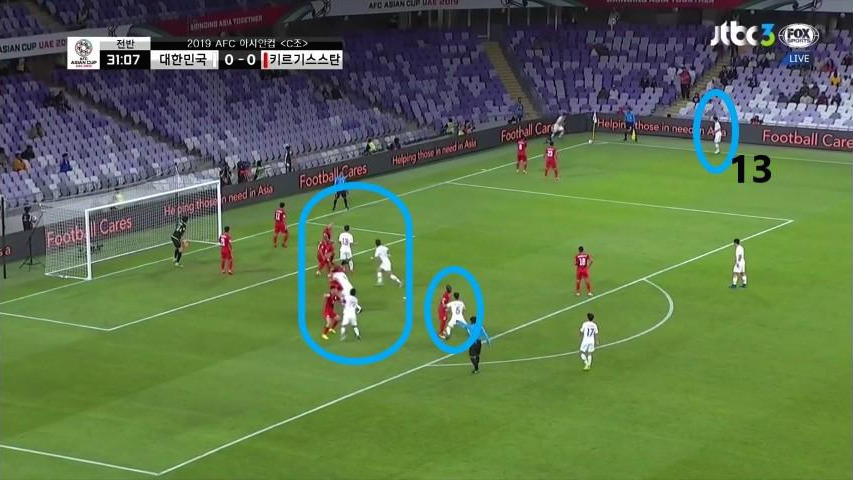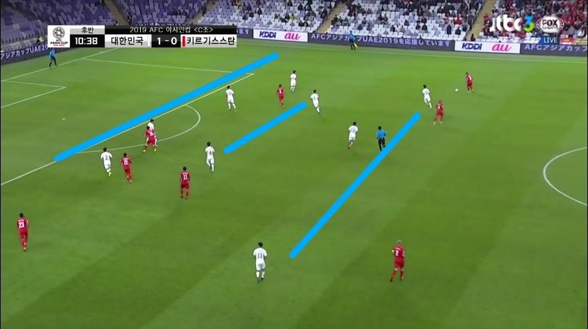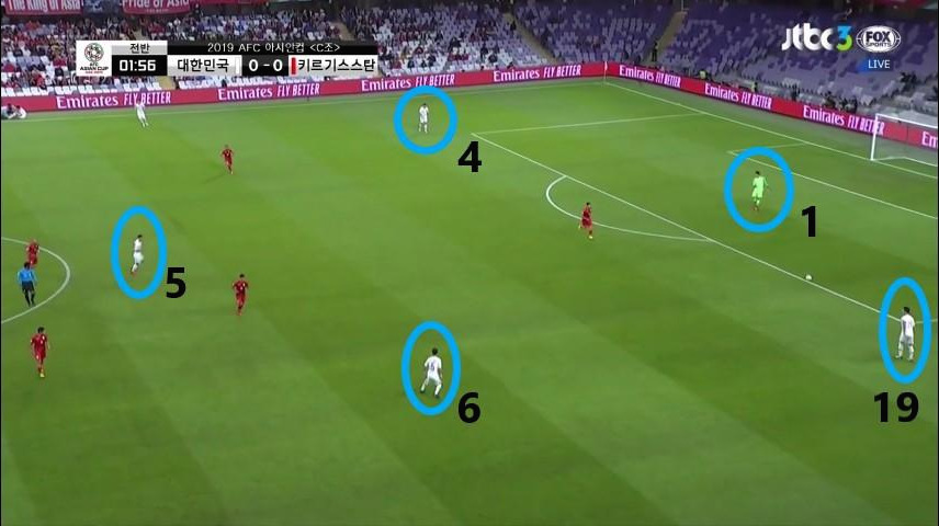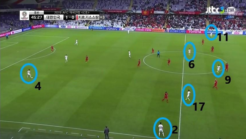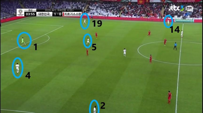 - 골키퍼(GK) '김승규'(1번)가 공격의 시작점 역할을 보이며 초기 빌드업(Build-up) 전개를 보여줌. '김영권'(19번)과 '김민재'(4번)가 좌우 측면으로 이동하면서 공간을 넓게 벌리며 전진 된 위치에 '이용'(2번)과 '홍철'(14번)이 공격 준비를 하고 있음. '정우영'(5번)이 중앙수비 지역으로 움직이면서 볼을 쉽게 받을 수 있는 지역으로 이동함.