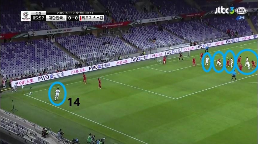- 상대 수비의 뒷공간을 활용하는 모습임. 상대 최종 수비라인이 미드필더(MF) 지역까지 전진 배치되어 있기에 후방에 넓은 공간이 발생한 상황임. '김영권'(19번)이 전방으로 볼을 넣어주면 '홍철'(14번)과 '구자철'(13번)이 뒷공간을 파고드는 움직임으로 좋은 기회를 노리고자 함.