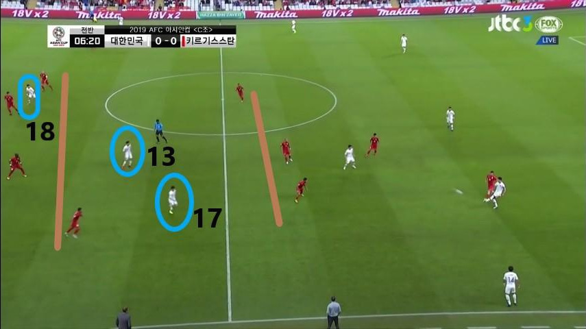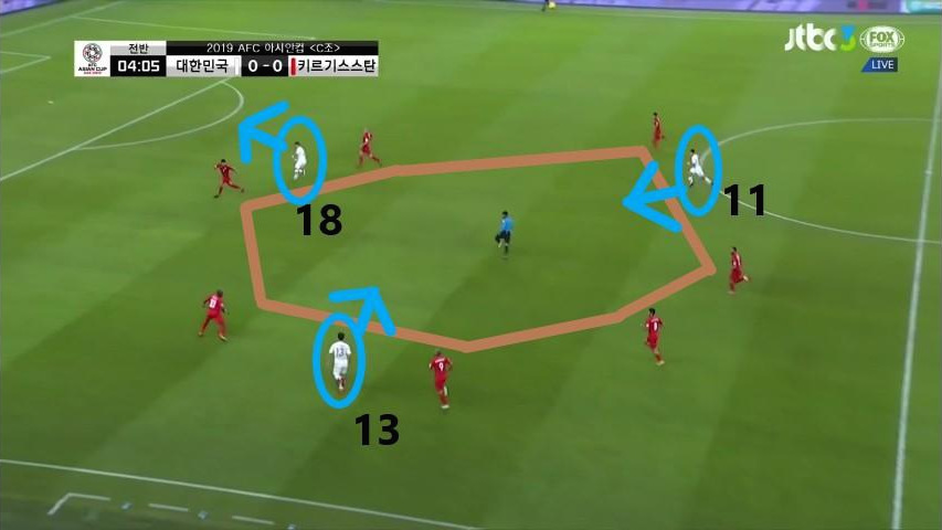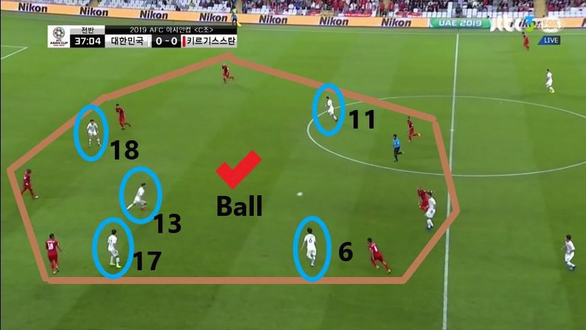 - 위의 사진과 비슷한 상황임. 위의 사진은 완전히 공격과 수비가 갖추어진 상황이라면 이번 사진은 수비는 갖추어진 반면, 공격은 시작점 단계라고 볼 수 있음. 이때, '구자철'(13번)이 볼을 소유하고 있으며 볼을 받아주기 위한 선수는 '정우영'(5번)과 '김민재'(4번)임. 동시에 비어있는 공간에 '황희찬'(11번)과 '이청용'(17번)이 위치하여 있기에 볼 소유와 공격 작업을 유리하게 진행할 수 있음.