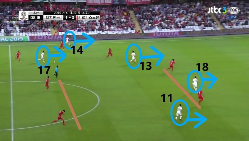 - 후반에 접어든 뒤 발생한 역습 상황임. '이청용'(17번)이 볼을 잡고 역습을 전개하는 시점에서 좌측면 수비수인 '홍철'(14번)이 오버래핑(Overlapping)에 가담하면서 측면을 이용한 볼 전개를 할 수 있도록 도와줌. 전방에서는 '황의조'(18번)가 중앙수비수와 함께 골문 방향으로 이동함. 2선에서는 '구자철'(13번)과 '황희찬'(11번)이 비어있는 공간을 향해 전진하면서 유리하게 볼을 진행할 수 있음.
