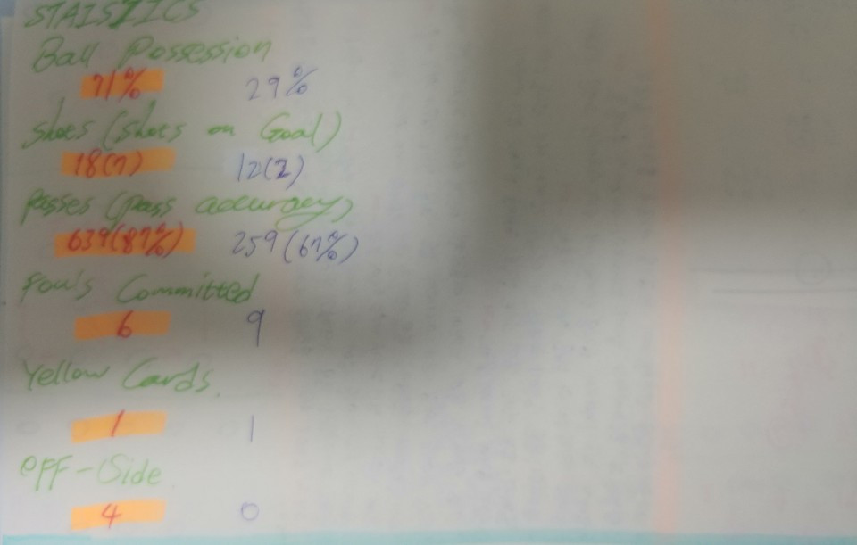 - 상대보다 월등히 앞서가는 점유율(71%)을 보이며 경기 전체를 지배함. 18번의 슈팅 대비 7번의 유효 슈팅을 기록한 점도 나쁘지 않은 통계자료이지만 1골밖에 득점하지 못했다는 점에서 상대를 압도했지만 골 운이 따르지 않았거나 혹은 공격 마무리 작업에서 정확도가 떨어졌을 것임. 상대가 수비지역에서 공간을 내주었음에도 패싱(639회-87%)의 기록은 선수 간 패싱 미스 혹은 컨트롤 실수에서 비롯된 것이라 볼 수 있음.