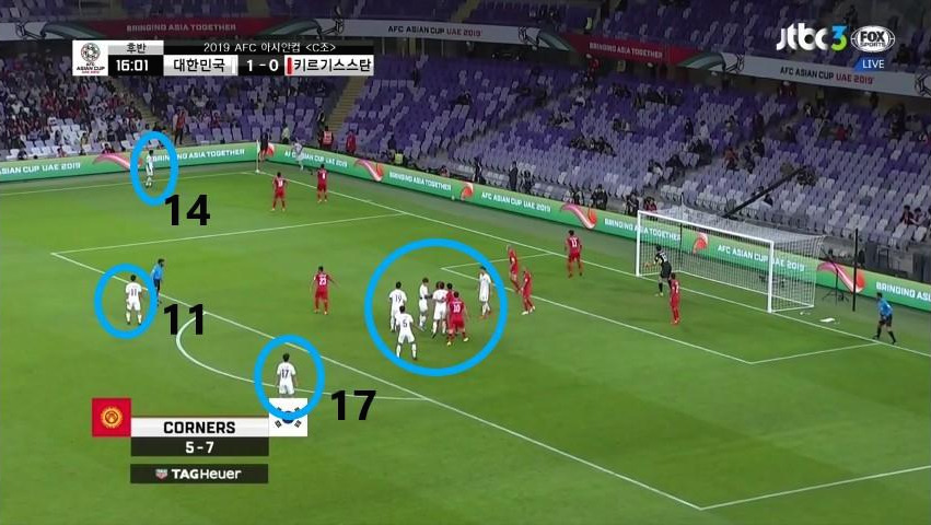 - 후반전의 코너킥(Coner Kick) 전술임. '홍철'(14번)이 키커(Kicker) 주위에 위치하고 '황희찬'(11번)과 '이청용'(17번)이 흘러나오는 세컨드 볼(Second ball)을 이용하고자 하는 위치에서 대기함. 페널티(PK) 박스 내부에는 선수들이 밀집하여 있으며 골대에서 먼 곳에 있기에 코너킥에서의 미리 약속된 플레이가 나올 가능성이 높음. (전진 뒤 헤더 혹은 선수의 형태 변화)