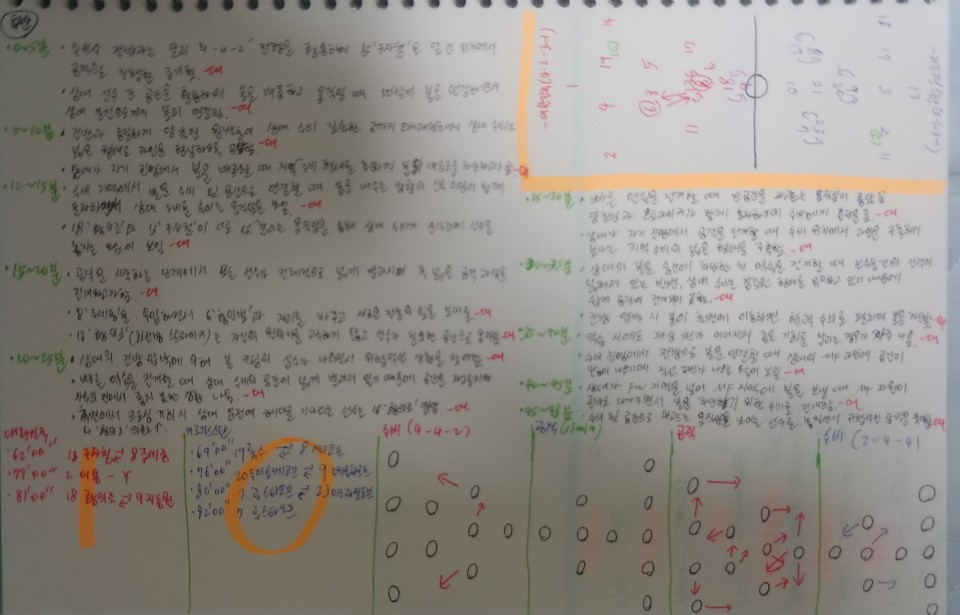 2. 상대 수비의 선수 간 비어있는 공간이 넓었음에도 불구하고, 이를 효율적으로 활용하지 못한 경우가 나옴. 미드필더 지역 혹은 2선 지역에서 공간을 내주고 공격 자원이 유리한 고지를 점령할 수 있게 해주었지만, 선수 간 의사소통, 패싱 미스로 기회를 무산시킴. 공간을 파고든다 할지라도, 유독 이 경기에서는 골운이 따르지 않아 기회를 날려버리는 경우가 많았음.