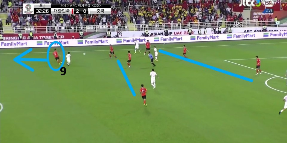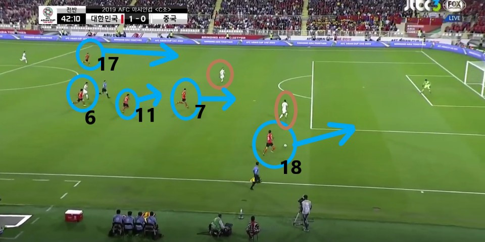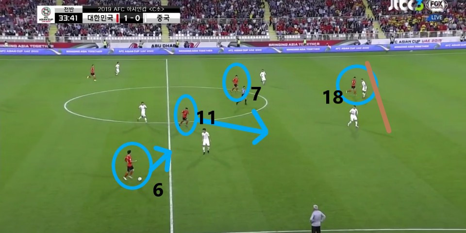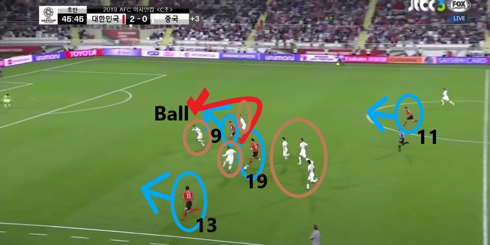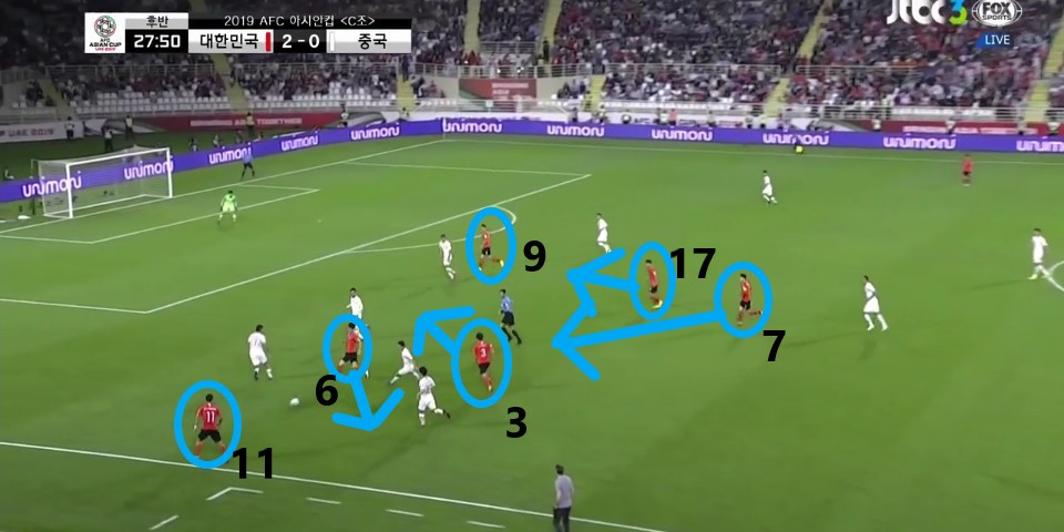 - 상대 볼을 차단한 뒤 곧바로 이어진 공격 모습임. 교체 투입된 '지동원'(9번)이 2선에서 전방에 있는 '손흥민'(7번)에게 볼을 이어주기 위해 움직임. 기존의 '황의조'의 위치에 '손흥민'이 위치하고 '지동원'이 2선에 위치하면서 '손흥민'의 돌파 능력을 극대화하기 위한 자리 변환임.