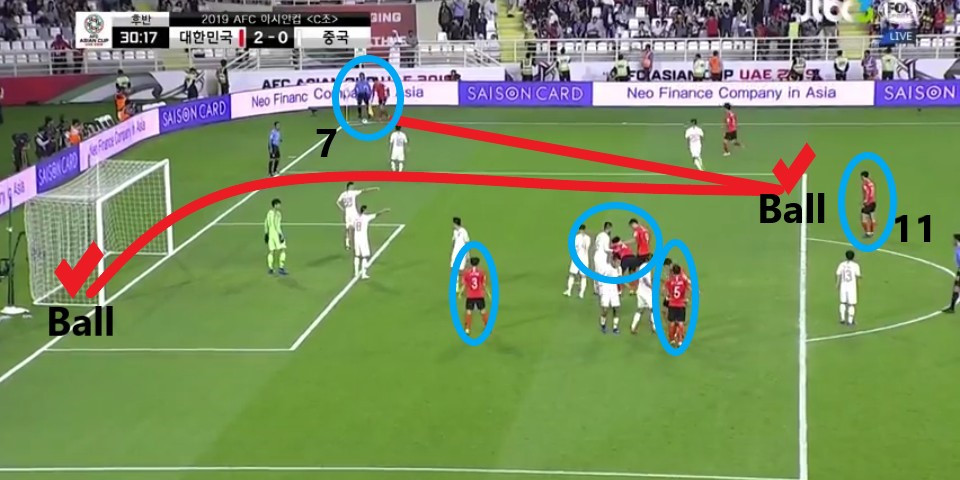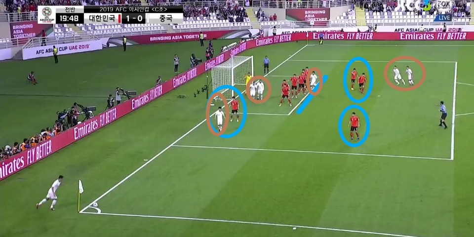 - 전반 초반에 나온 코너킥(Coner Kick) 상황임. 페널티(PK)박스 내부에 공중볼 능력이 좋은 선수들이 상대 수비수와 개인별로 경합을 하기 위해 자리를 잡고 있음. '황의조'(18번)와 '김영권'(19번)이 골문 주변에서 상대와 경합하며 상대를 유인하고 '김민재'(4번)가 골문 앞쪽에서 헤더를 노리려는 움직임을 볼 수 있음.