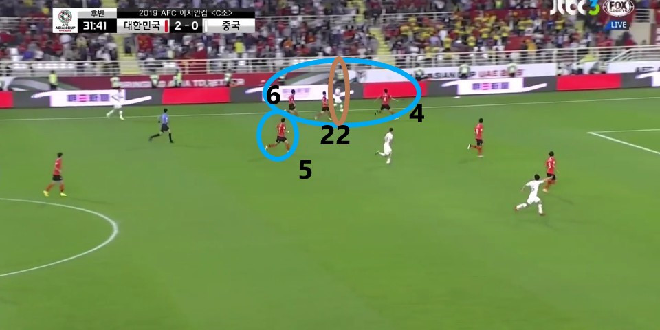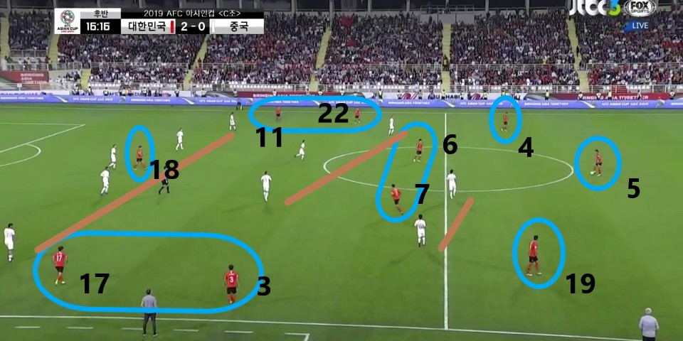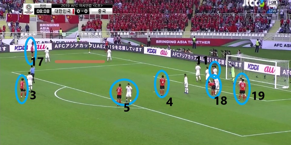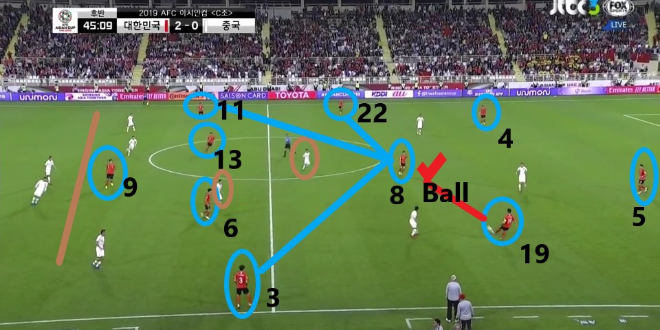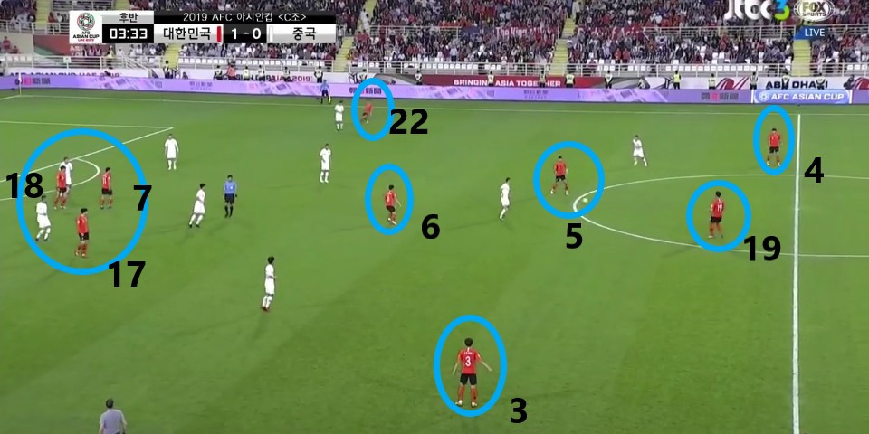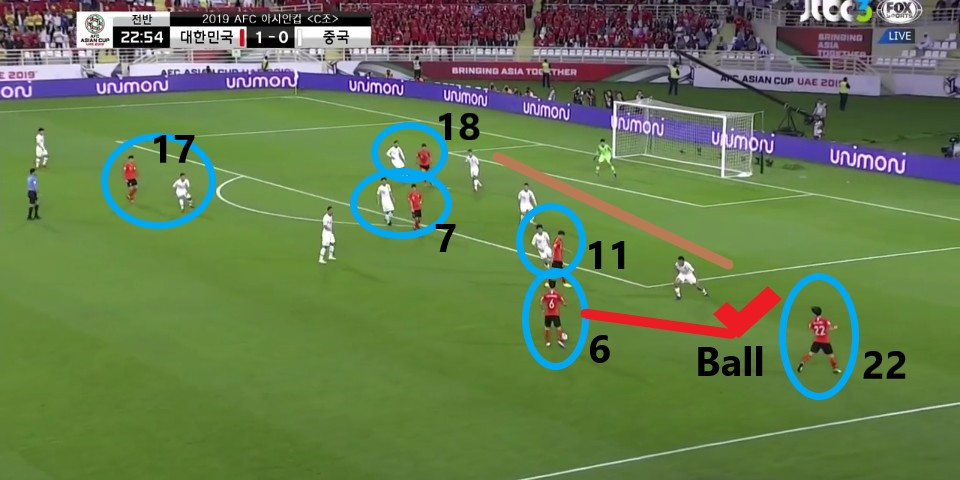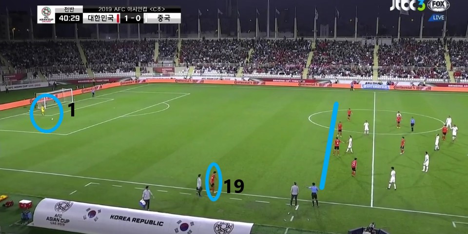 - 이전 상황에서 '김영권'(19번)이 부상으로 잠시 아웃되어 있는 상황에서 얻어낸 골킥(Goal Kick) 상황임. 한 명의 선수가 터치 라인(Touch Line) 밖으로 나가있기에, 빌드업(Build-up) 과정이 불리할 것이라는 판단하에 감독이 라인을 올린 상황임. 골킥부터 빌드업을 진행한 이전과는 다른 장면임.