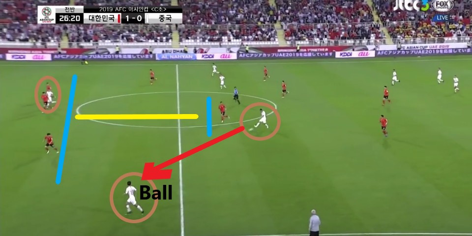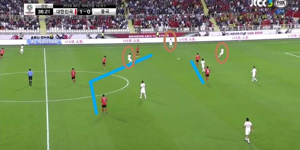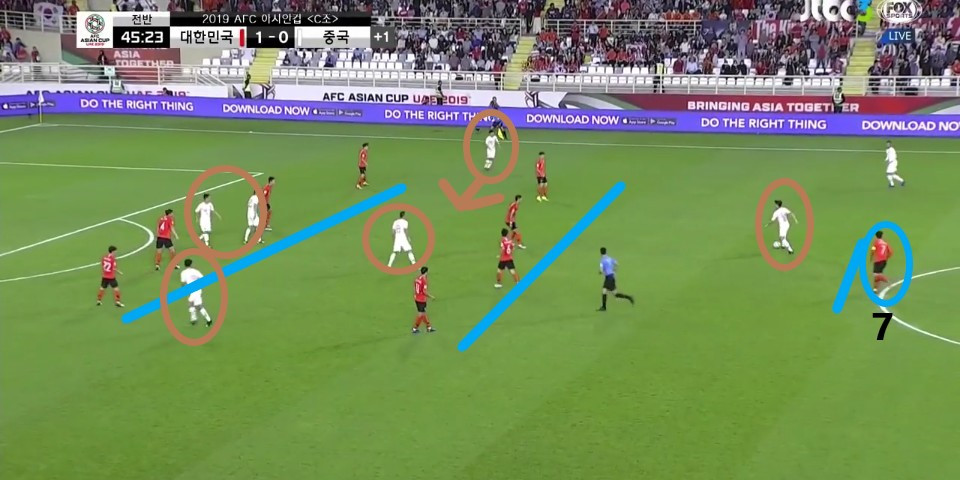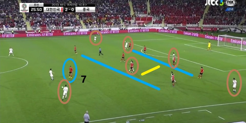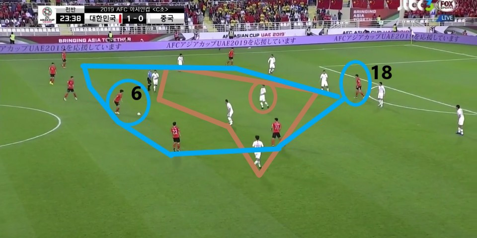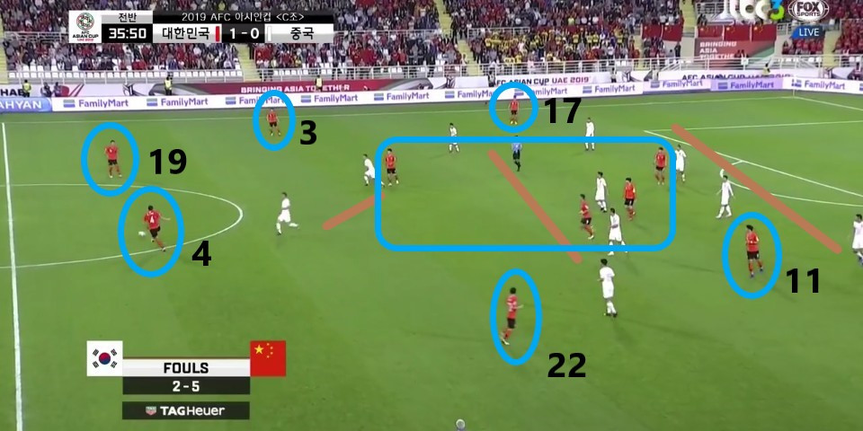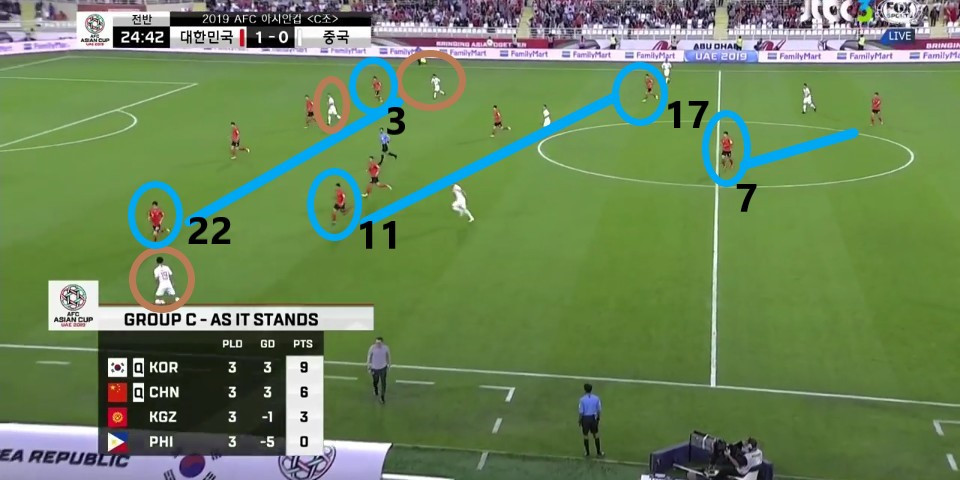 - 이전 상황에서 '김영권'(19번)이 부상으로 잠시 아웃되어 있는 상황에서 얻어낸 골킥(Goal Kick) 상황임. 한 명의 선수가 터치 라인(Touch Line) 밖으로 나가있기에, 빌드업(Build-up) 과정이 불리할 것이라는 판단하에 감독이 라인을 올린 상황임. 골킥부터 빌드업을 진행한 이전과는 다른 장면임.