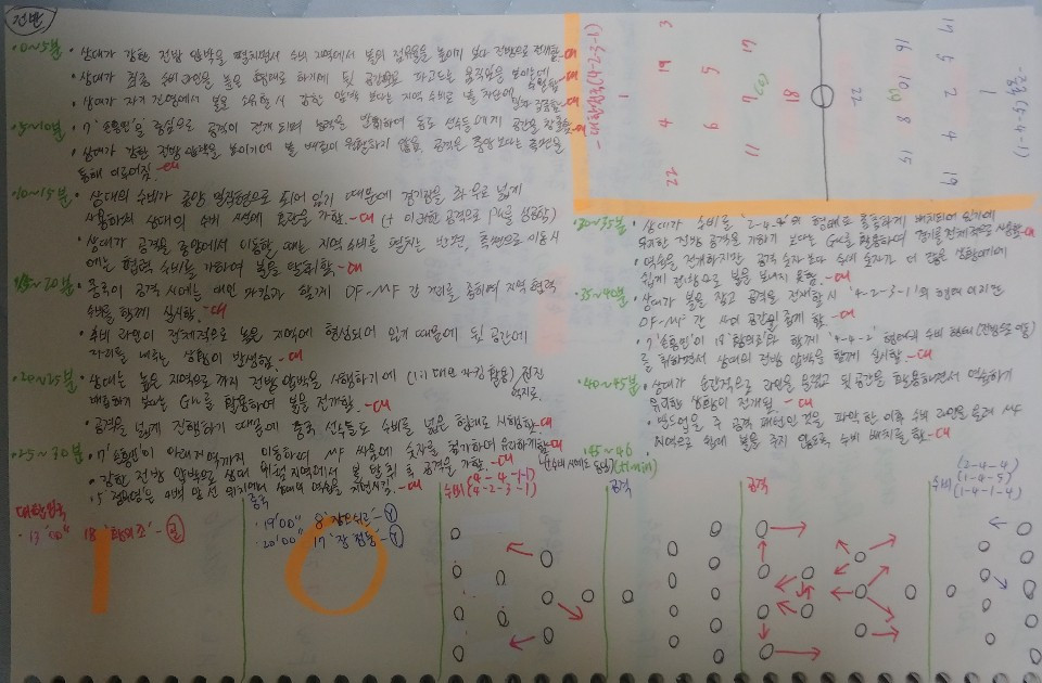 1. 선수들의 약속된 플레이를 기반으로 한 유기적인 움직임이 돋보이는 경기였음. 온더볼과 오프더볼의 선수들이 함께 자신이 위치해야 할 지역이 어디이고, 패싱을 주어야 할 공간이 어디인지를 알기에 수월한 공격 작업이 이루어지는 경우가 많았음. 지속적인 무빙과 패싱이 효력을 발휘하여 PK와 코너킥을 얻어냈고 이를 득점으로 성공함.