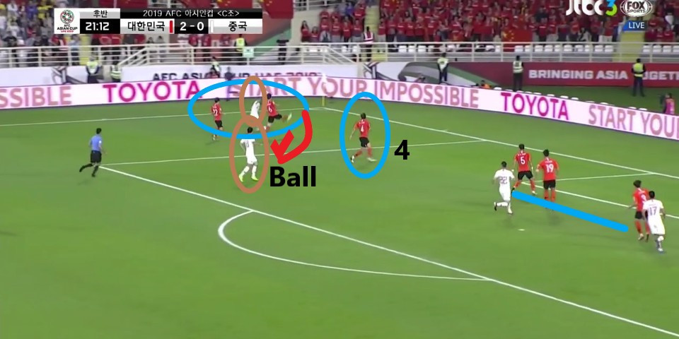 - 상대가 측면으로 공격할 시 강한 압박을 하여 볼을 탈취하려는 시도였으나, 볼이 뒤쪽에 있는 선수에게 패싱(Passing) 연결되는 장면임. '김민재'(4번)가 페널티(PK)박스에서 뒤쪽의 수비를 놓치는 상황임. 만약, 개인 돌파 능력이 좋은 선수였다면 상대의 득점으로 이어질 수 있는 위험한 과정이었음.