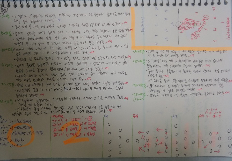 2. 역습 상황에서 좋은 기회를 놓치는 장면이 여러 번 나옴. 자신감 있는 플레이로 돌파는 하였으나 마지막 부분에서의 세밀함이 부족하여 골로 연결시키지 못한 부분이 아쉬웠음. 상대 선수가 없는 비어있는 공간을 돌파하는 선수를 활용하거나 혹은 마지막에서 좀 더 집중하여 골로 연결시킨다면 더 많은 득점을 올릴 수 있지 않았을까 하는 생각을 해보게 됨.