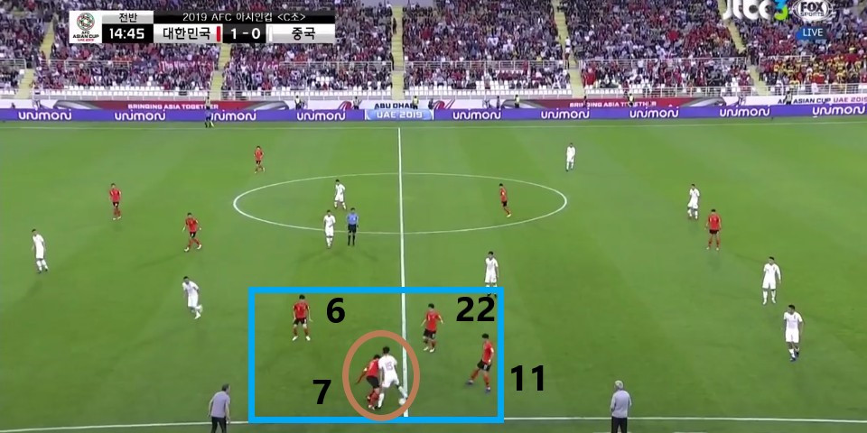 - 상대의 7명의 수비 자원이 중앙에 밀집되어 있는 장면임. 때문에, 8명의 공격 자원이 밀집된 형태의 외곽에 위치할 수 밖에 없음. 또한, 상대가 수비형태 중앙에 선수를 배치하여 '황인범'(6번)이 '황의조'(18번)에게 직선 패싱을 연결하지 못하도록 배급로를 차단함.