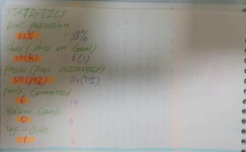 - 경기 내내 상대는 우리와 비슷한 전술과 전략으로 게임에 임하였음. 하지만, 점유율(62%), 슈팅(17회-유효슈팅 8회) 숫자를 보이며 상대보다 더 공격적으로 경기에 임하였음. 이를 통해, 선수 개개인 별로 상대보다 능력이 더 뛰어남을 확인할 수 있음. 뿐만 아니라, 515회의 패싱 횟수 중 84%의 정확도를 기록하며 경기를 지배하여 상대를 압도하였다고 할 수 있음.