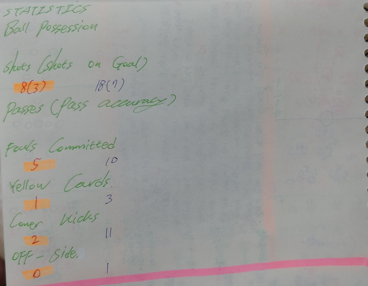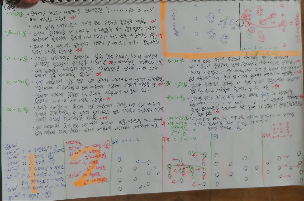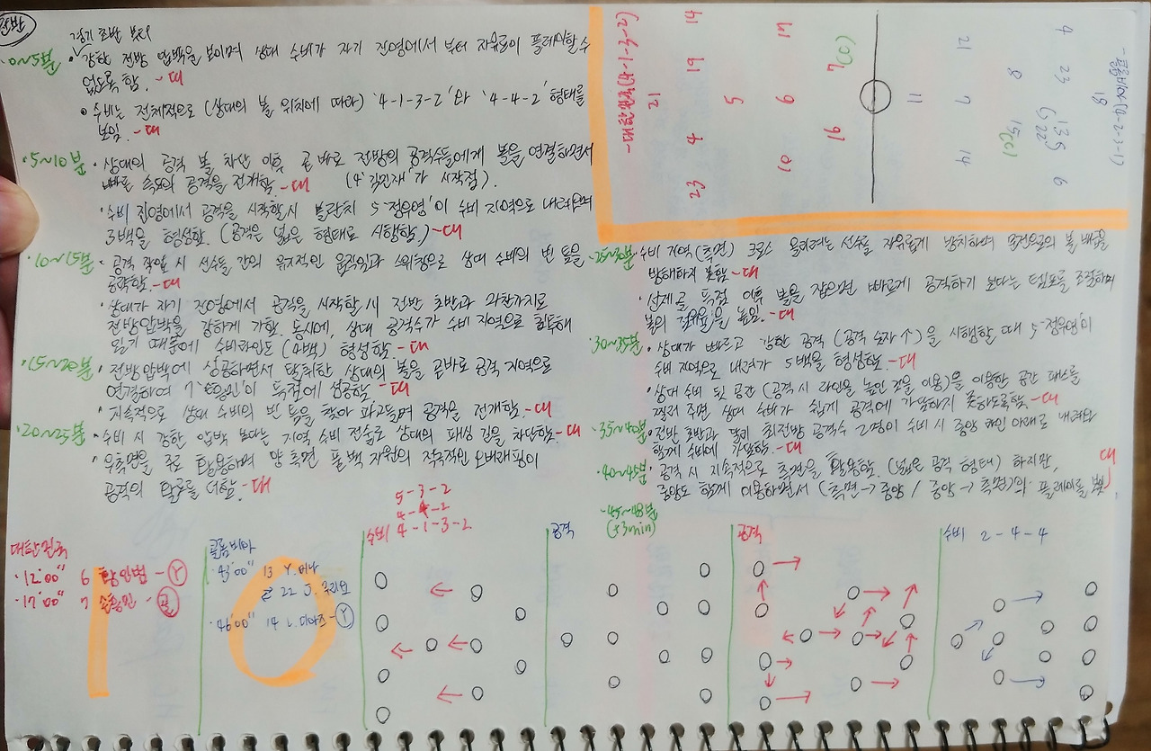 - 경기가 끝날 무렵 코너킥(Coner-kick)을 얻어낸 상대가 준비한 전술을 확인할 수 있는 장면임. 먼저, 상대는 페널티 박스(PK) 내부에 피지컬(Physical) 능력이 좋은 4명의 선수를 배치함. 동시에, 박스 내부에서 흘러나오는 세컨드 볼(Second-ball)을 받아내기 위해 페널티 박스 외곽에 3명의 선수를 배치하며 경기 마지막까지 동점 골에 대한 의지를 표명함. 이때, 수비는 9명의 선수가 상대의 헤더(Header)를 방해하기 위해 페널티 박스 중앙에 집중적으로 배치되어있음.