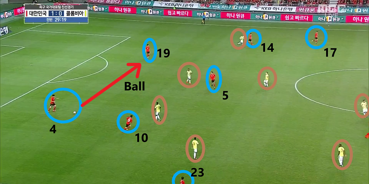 - 수비 진영에서 '김민재'(4번)가 '김영권'(19번)에게 볼을 배급하면서 공격을 시작하는 장면임. 이때, 주목할 만한 부분은 상대 공격자원의 첫 수비(First-defence) 위치임. 수비라인을 내리지 않고, 라인을 유지하며 전방 압박(Gegen-pressing)을 실시함. 상대가 공격적인 수비를 보이기에, 미드필더(MF)와 양 측면 풀백(Full-back) 자원들의 전방으로의 움직임에 방해를 받게 됨.(볼이 빠르게 전방으로 이어지지 못함.)