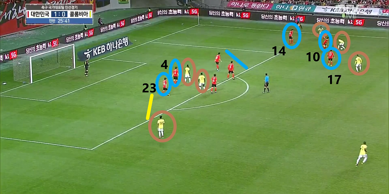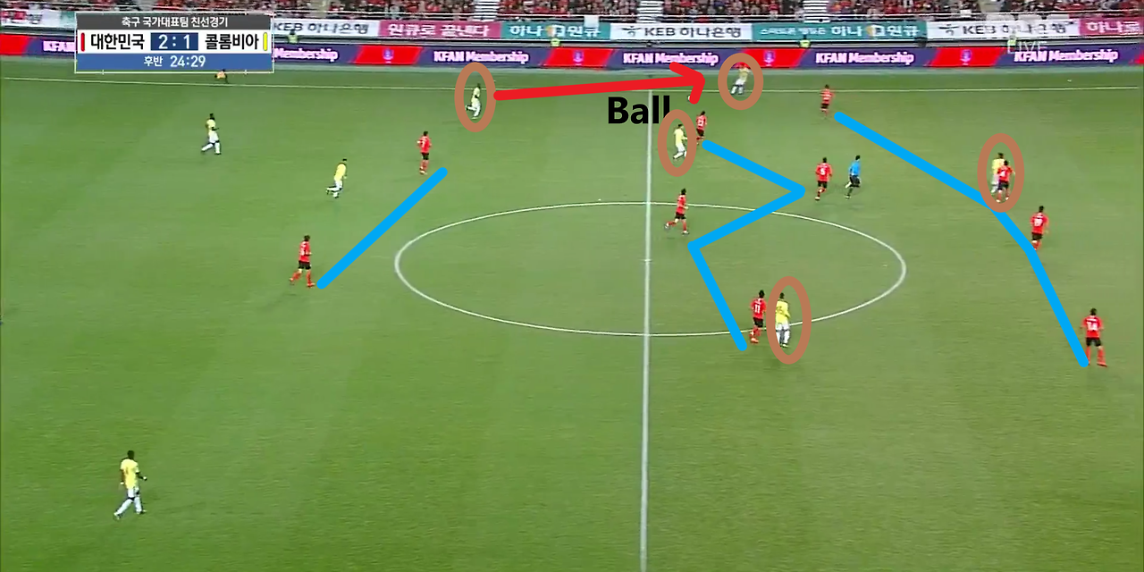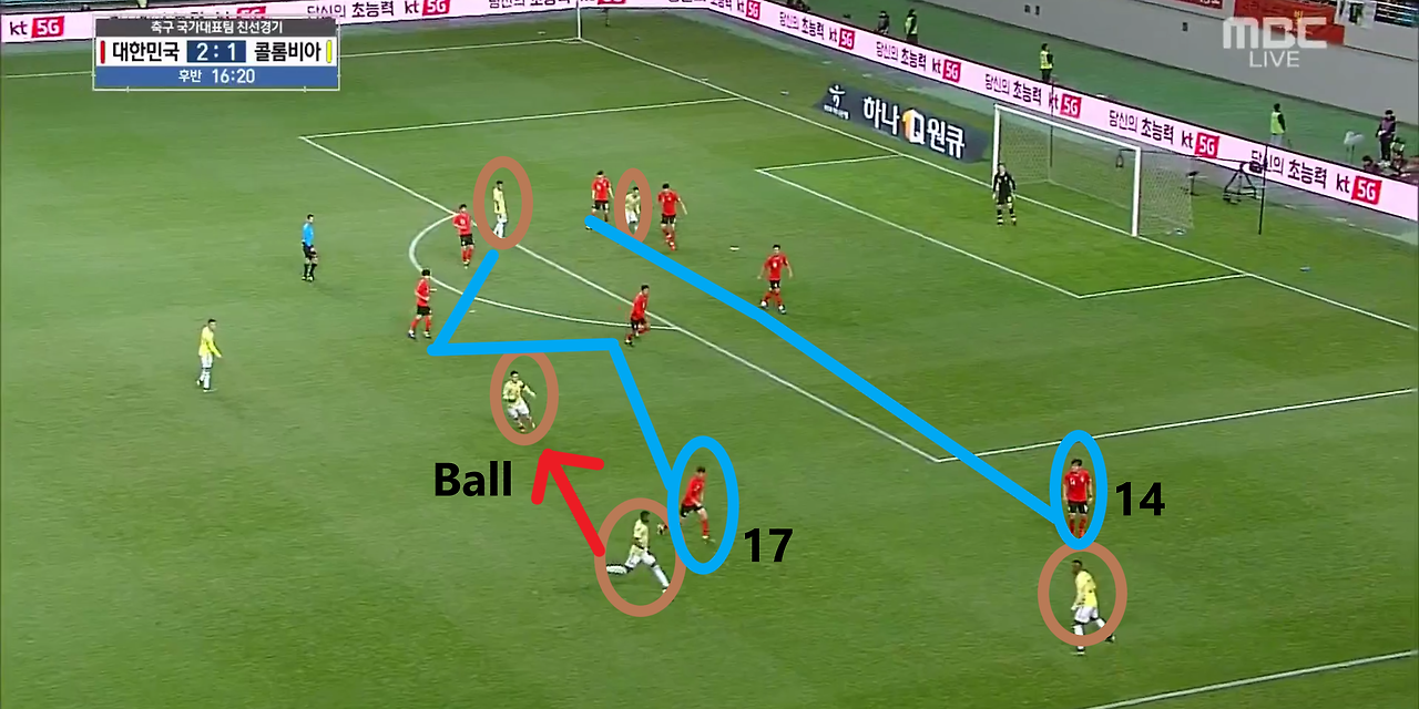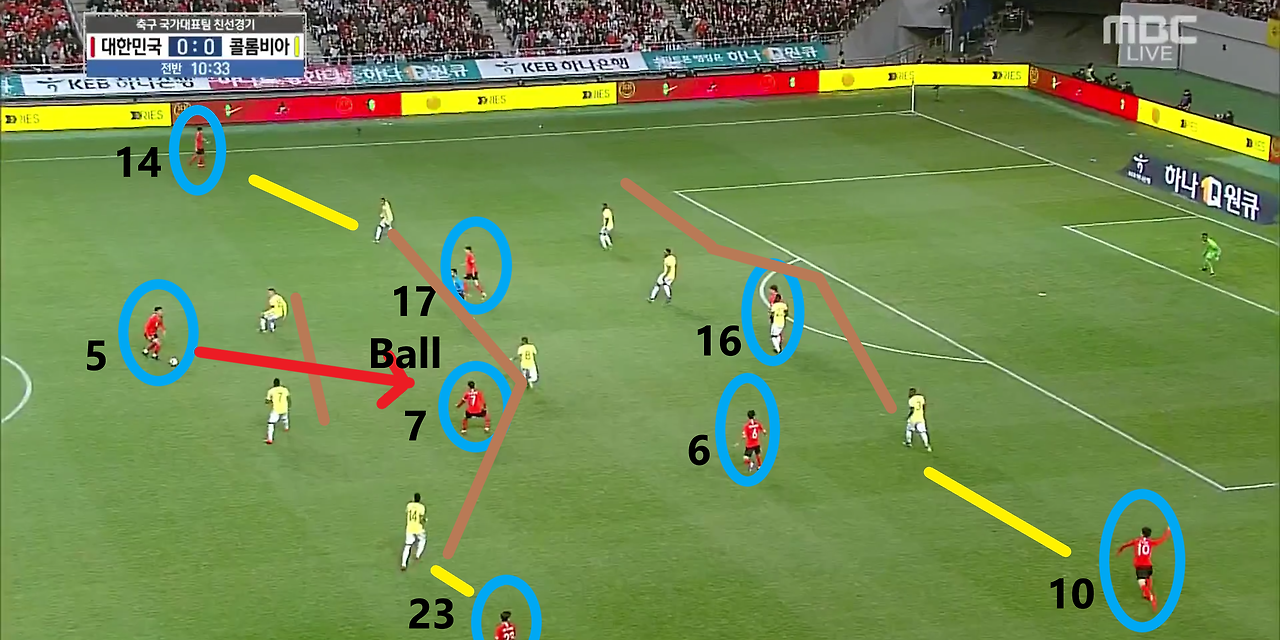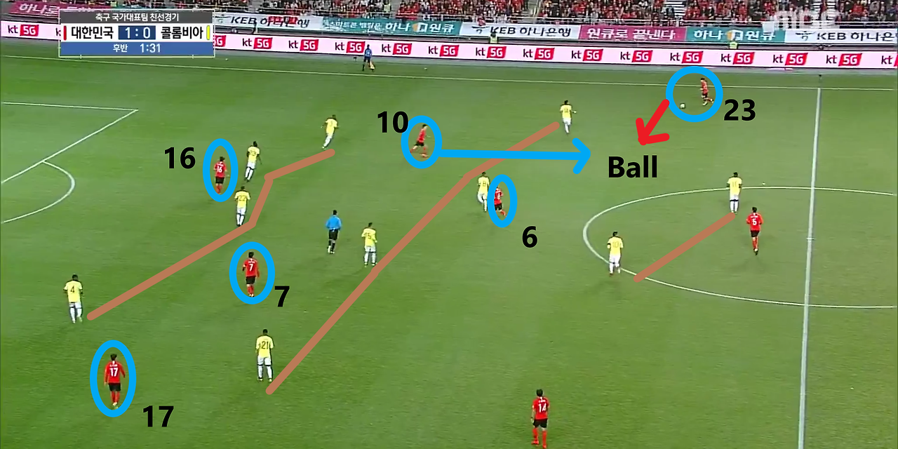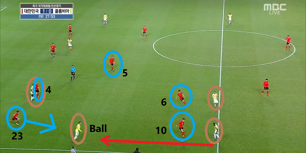 - 상대가 측면에서 공격을 전개하는 과정에서 수비적인 움직임을 확인할 수 있는 장면임. 온더볼(On-the-ball)과 주위의 오프더볼(Off-the-ball)의 선수들을 대인 방어(Man-to-man)하며 상대의 볼 진행 차단을 위한 수비를 보임. '이재성'(10번)과 '김문환'(23번)이 각각 패스를 내어주고 받는 선수를 마크하며, '김민재'(4번)와 '황인범'(6번)은 각각 주변의 선수들을 마크함. 또한, '정우영'(5번)은 중앙에 위치하며 상대가 중앙으로 쉽게 볼을 연결하지 못하도록 지역 방어(Zone defence)를 행함.