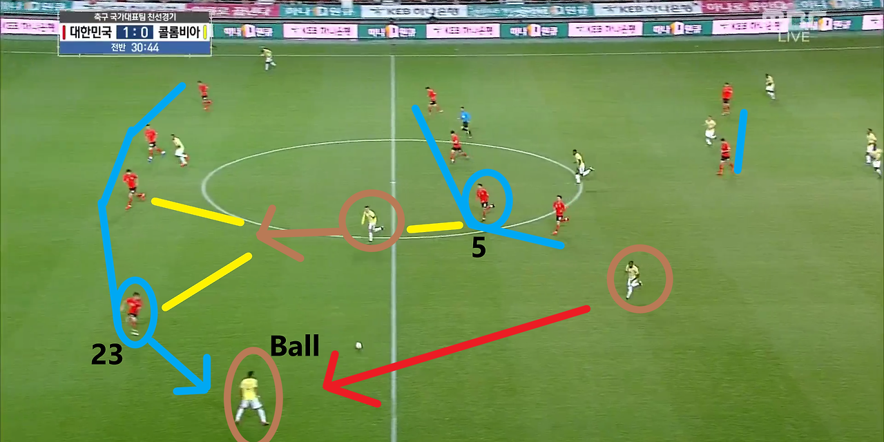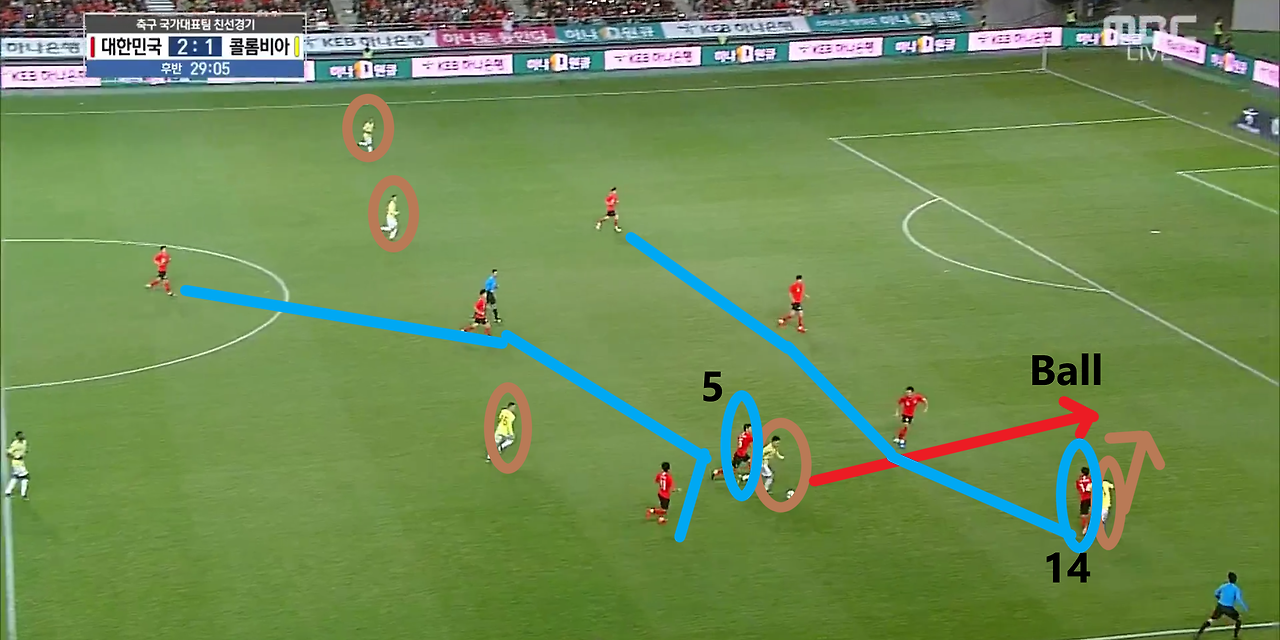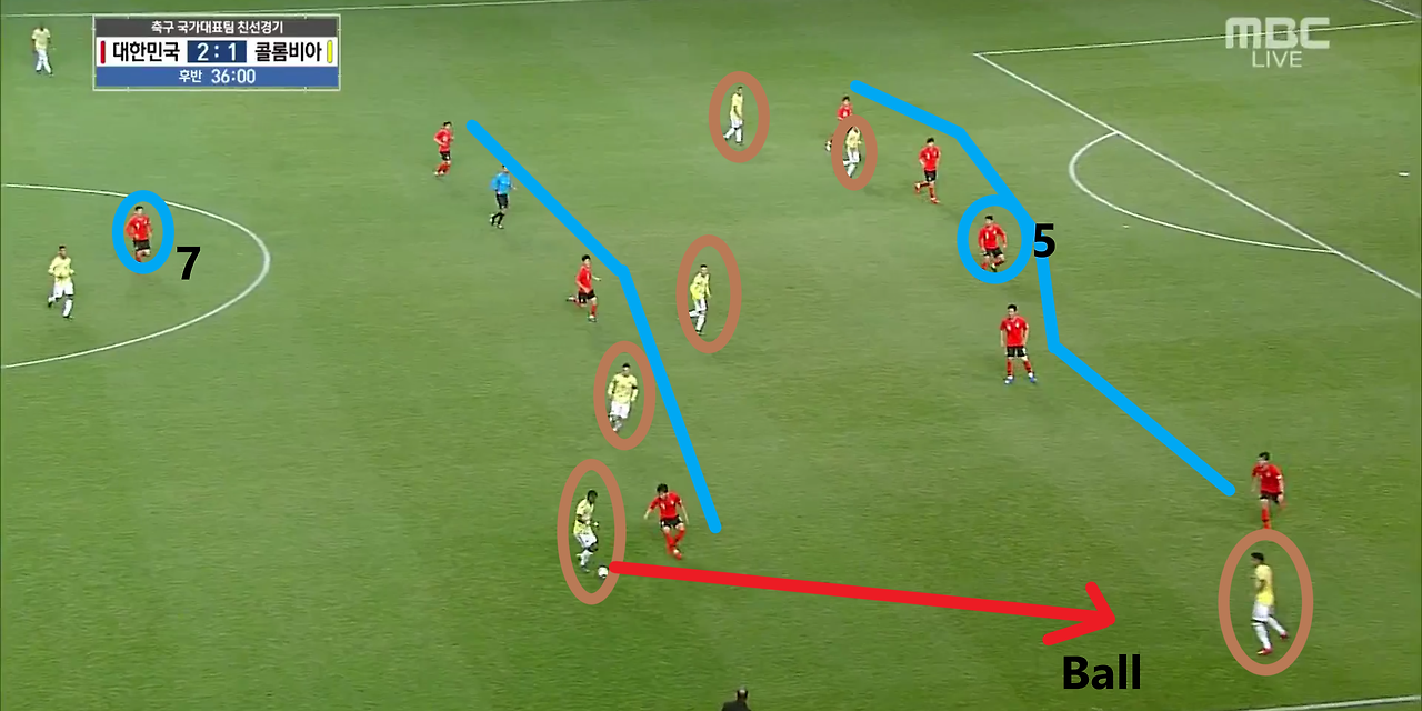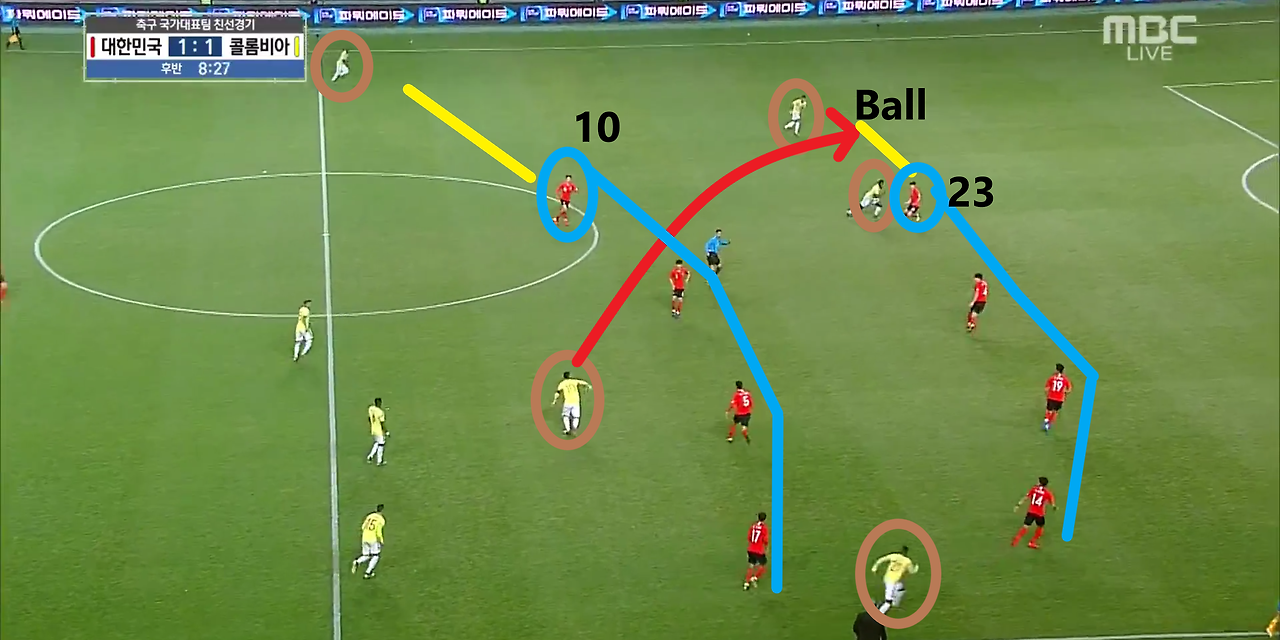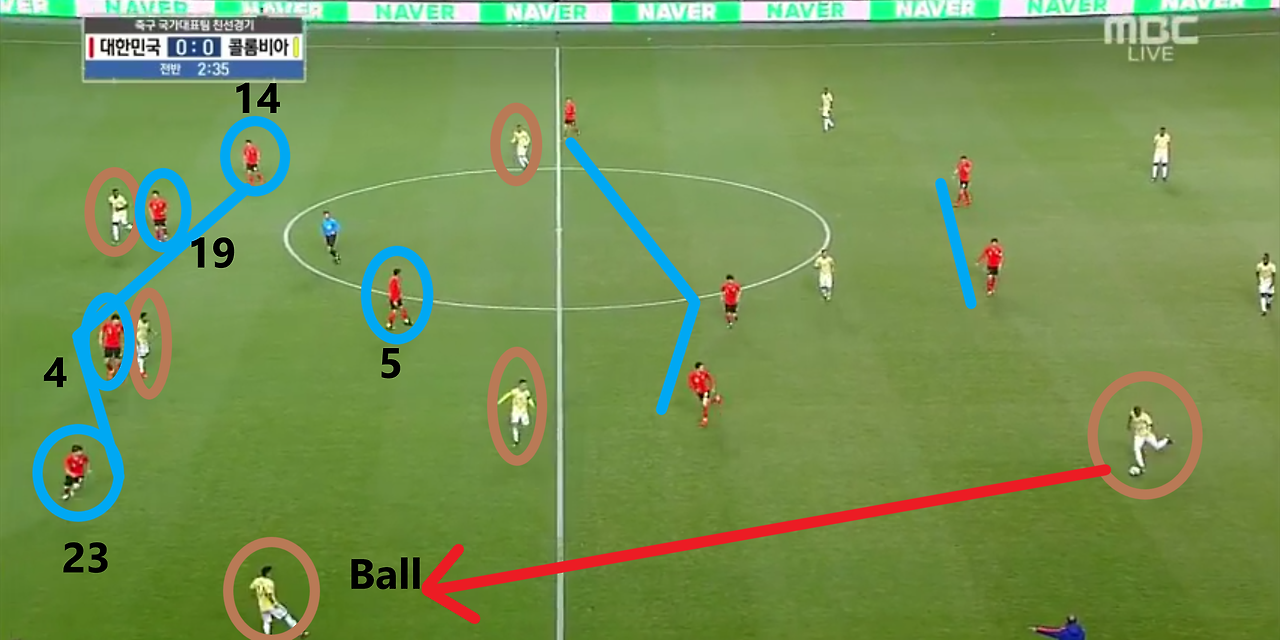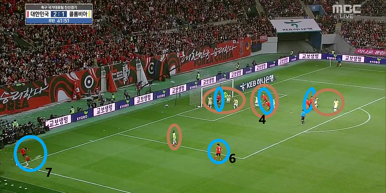 - 상대가 측면에서 공격을 전개하는 과정에서 수비적인 움직임을 확인할 수 있는 장면임. 온더볼(On-the-ball)과 주위의 오프더볼(Off-the-ball)의 선수들을 대인 방어(Man-to-man)하며 상대의 볼 진행 차단을 위한 수비를 보임. '이재성'(10번)과 '김문환'(23번)이 각각 패스를 내어주고 받는 선수를 마크하며, '김민재'(4번)와 '황인범'(6번)은 각각 주변의 선수들을 마크함. 또한, '정우영'(5번)은 중앙에 위치하며 상대가 중앙으로 쉽게 볼을 연결하지 못하도록 지역 방어(Zone defence)를 행함.